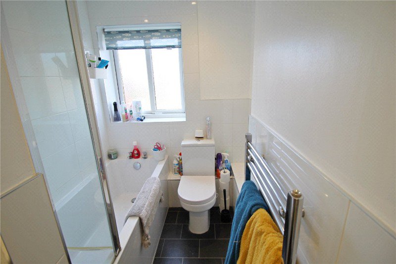 With frosted UPVC window to the front aspect, comprising a refitted and reconfigured modern three-piece suite, low level WC, wash hand basin and panel bath with shower over and glass screen, ½ tiled walls, chrome heated towel rail, extractor fan and tiled effect flooring.