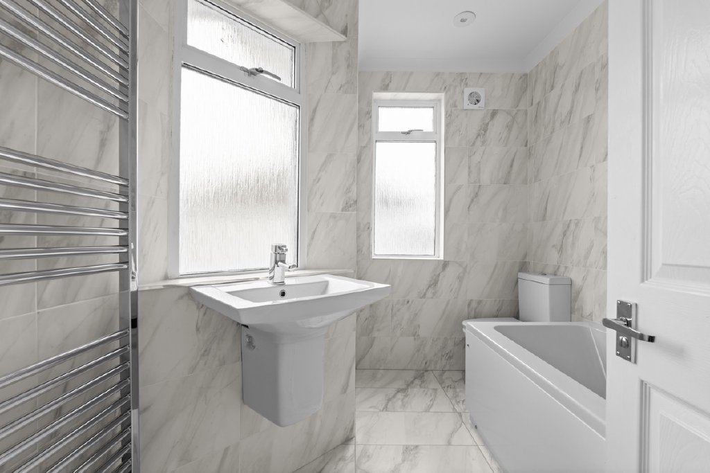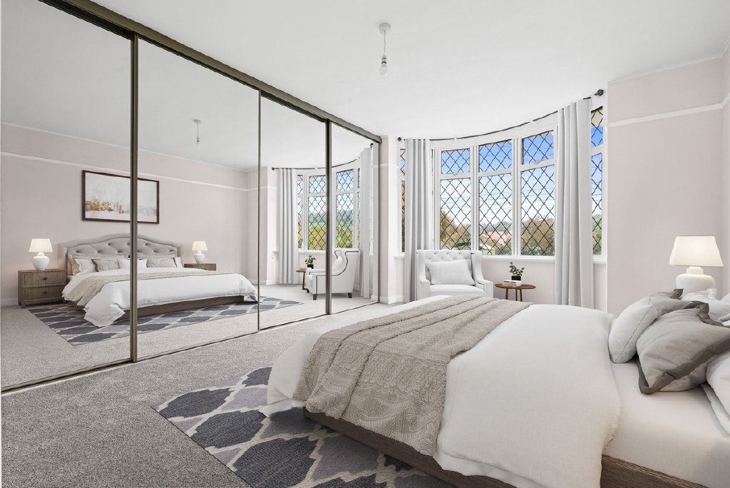 Upstairs, four double bedrooms provide excellent family accommodation, including an impressive principal bedroom with fitted mirror-fronted wardrobes and a large bay window framing superb countryside views. A newly fitted contemporary family bathroom completes the first floor.