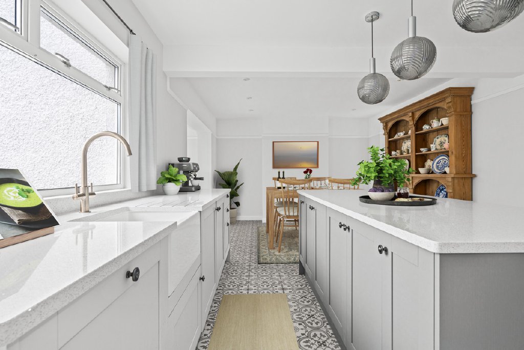 The beautifully appointed kitchen/dining/family room provides a superb space for both entertaining and everyday living. There are ample wall and floor units finished with elegant quartz worktops, a central dining island, and a range of luxury integrated appliances including a ceramic hob with extractor, microwave, oven/grill, fridge/freezer, dishwasher, and wine cooler. Stylish wall and floor tiling, thoughtful lighting, and direct access to the rear garden complete this impressive space.