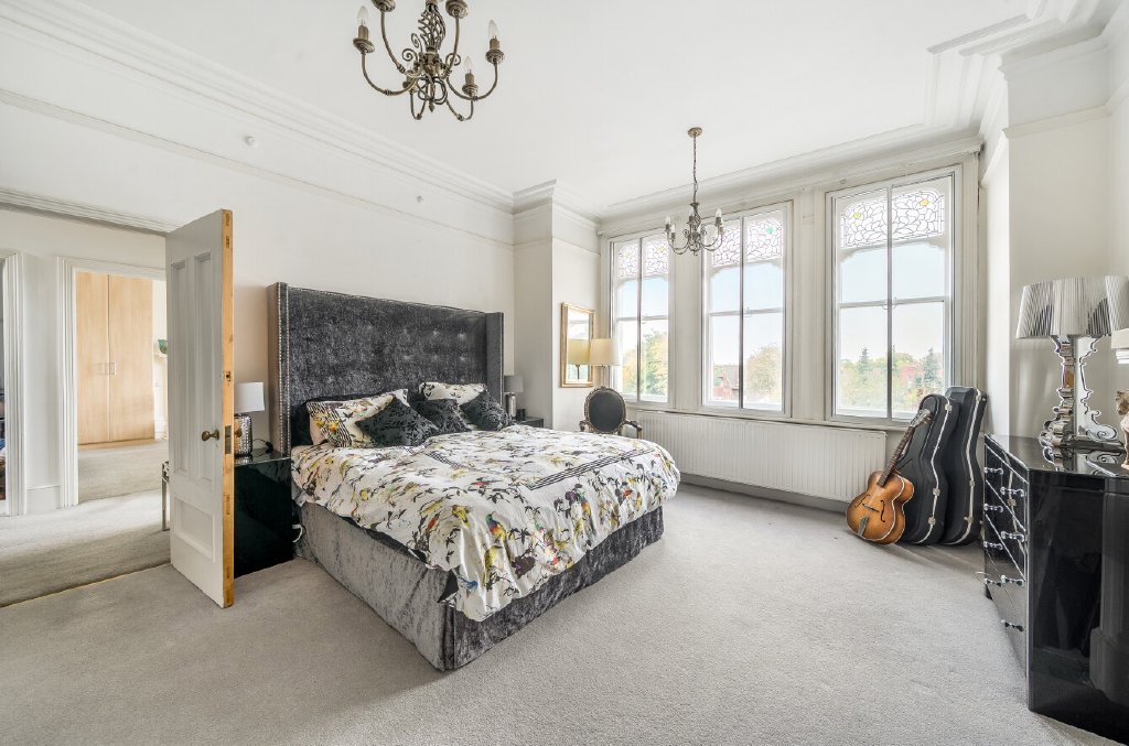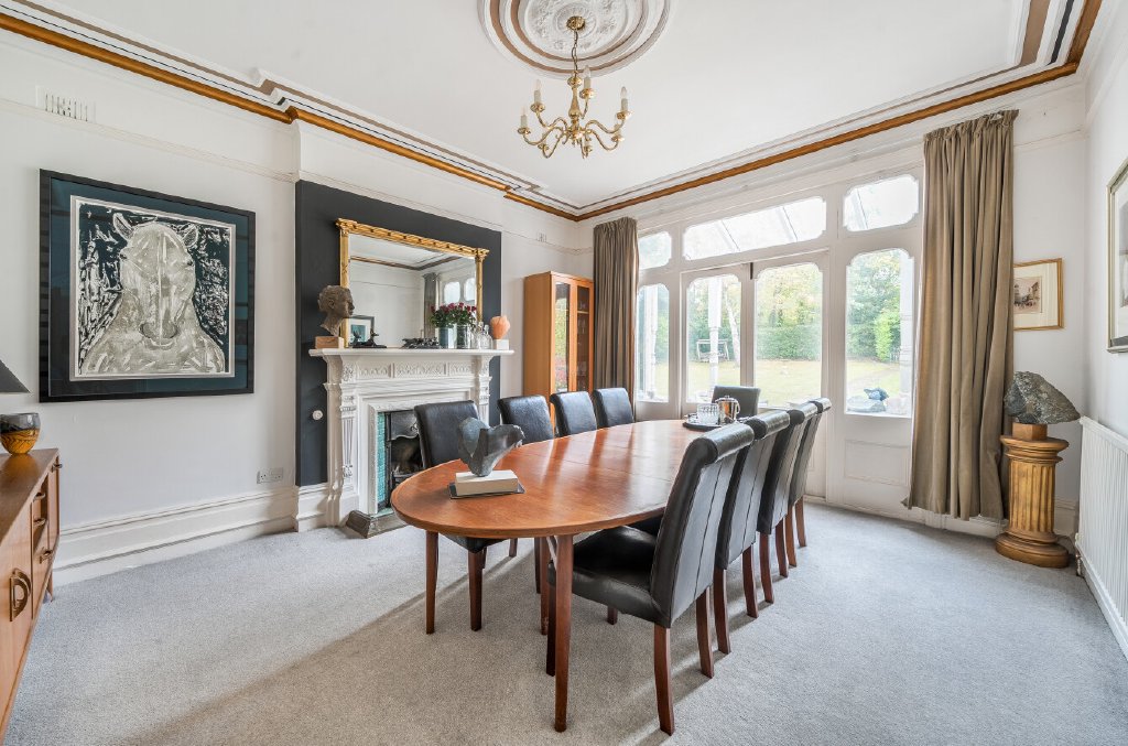 The ground floor offers refined living and entertaining spaces, including a grand reception room with deep bay sash windows and a striking fireplace, an elegant sitting room, and a formal dining room with double doors opening onto lush gardens. The stylish kitchen is perfectly suited for hosting gatherings, and the utility room and downstairs WC add everyday convenience.