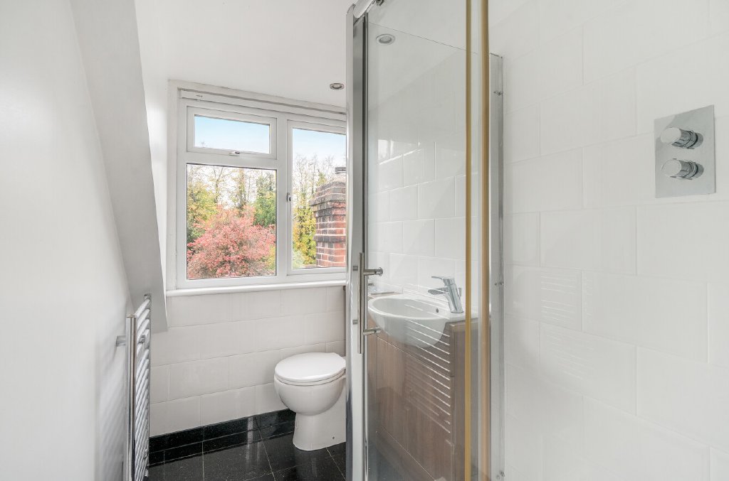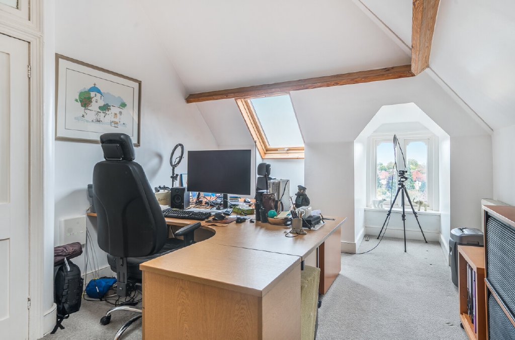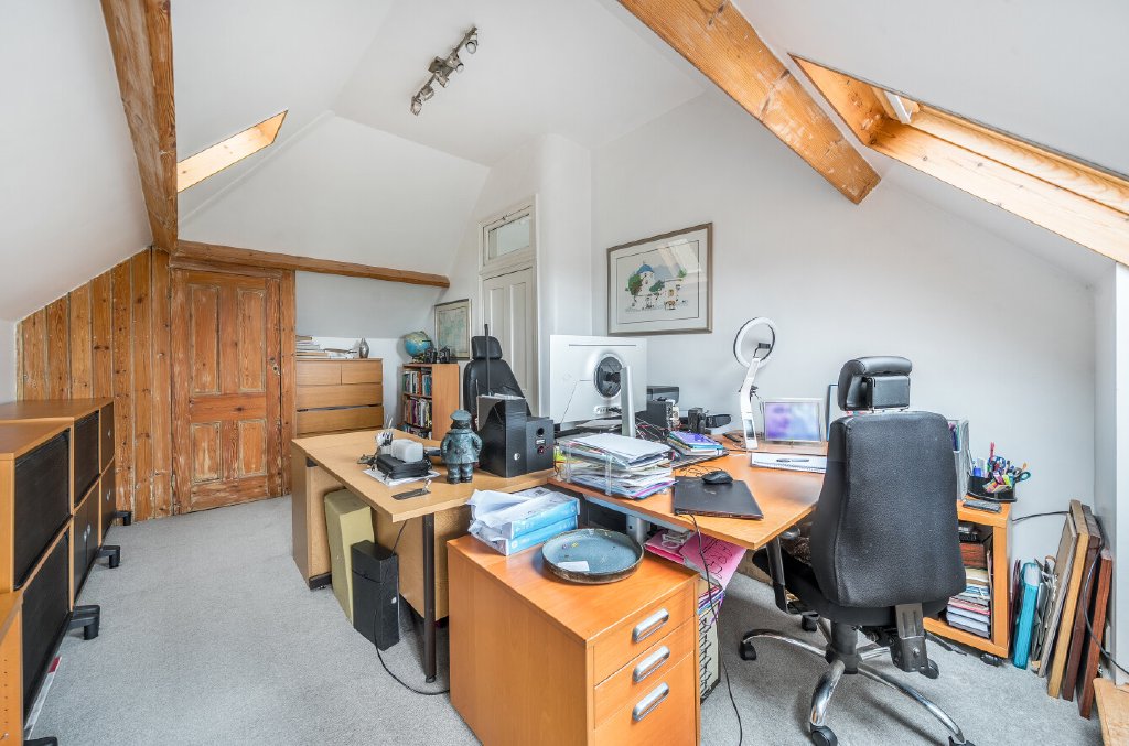 Upstairs, discover four generous double bedrooms, a family bathroom, a separate WC, and an additional family shower room. Ascend to the top floor to find two more double bedrooms—one with an en-suite—and abundant natural light from Velux windows.