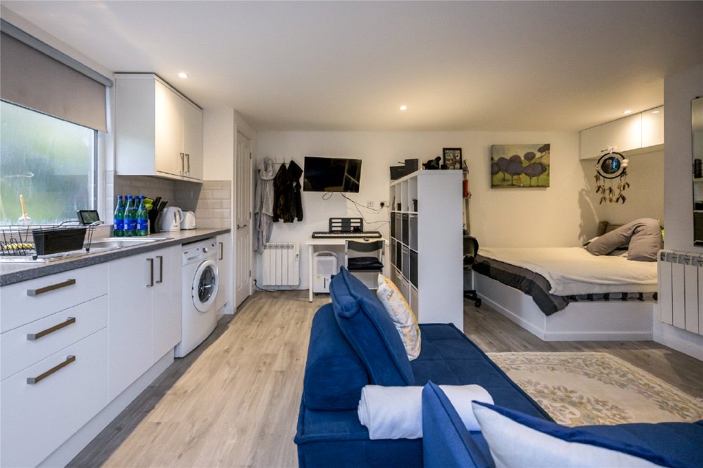 To the right-hand side of the property is a private access gate leading to a self-contained garden studio with bedroom/living/kitchen space and a shower room. The garden studio features a courtyard seating area and is complete privatised from the main home, offering a brilliant opportunity for income potential.