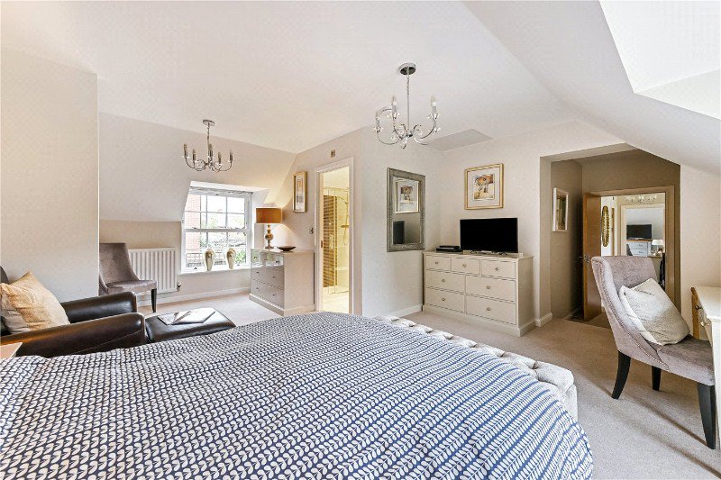 Upstairs, the accommodation is both generous and beautifully presented. The principal bedroom is a luxurious retreat, offering ample space for a king-sized bed and seating area, enhanced by fitted wardrobes and dual aspect windows that fills the room with natural light. Its en-suite shower room features a fully tiled walk -in enclosure, chrome fittings, and a wall -hung WC for a sleek, contemporary finish. The second bedroom is equally well proportioned, decorated in calm, neutral tones and benefitting from its own stylish en-suite and fitted dressing area. The third bedroom is a large double room that provides excellent versatility, currently arranged as an upstairs study. The fourth and fifth bedrooms are comfortable doubles, with attractively decorated with thoughtful details. A beautifully appointed family bathroom completes the upper floor, offering a full -sized bath with overhead shower and large-format tiling.