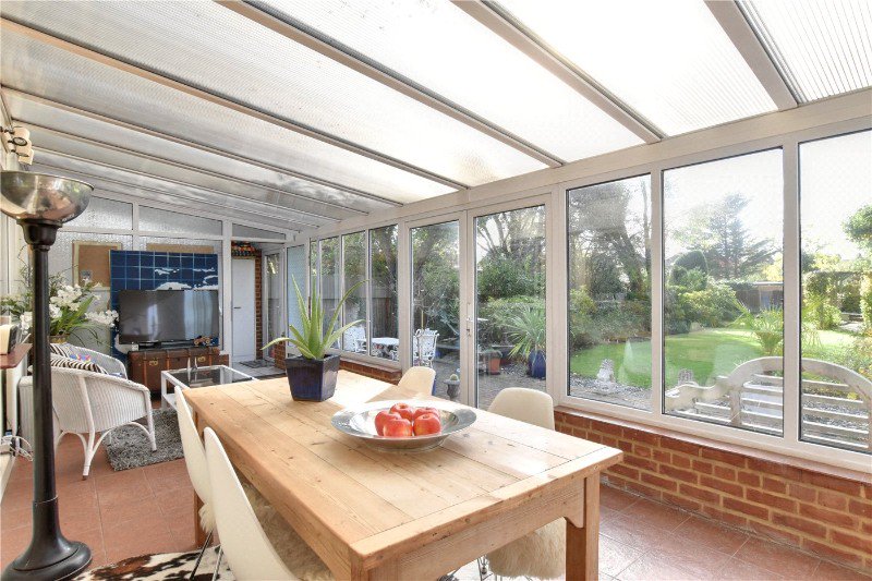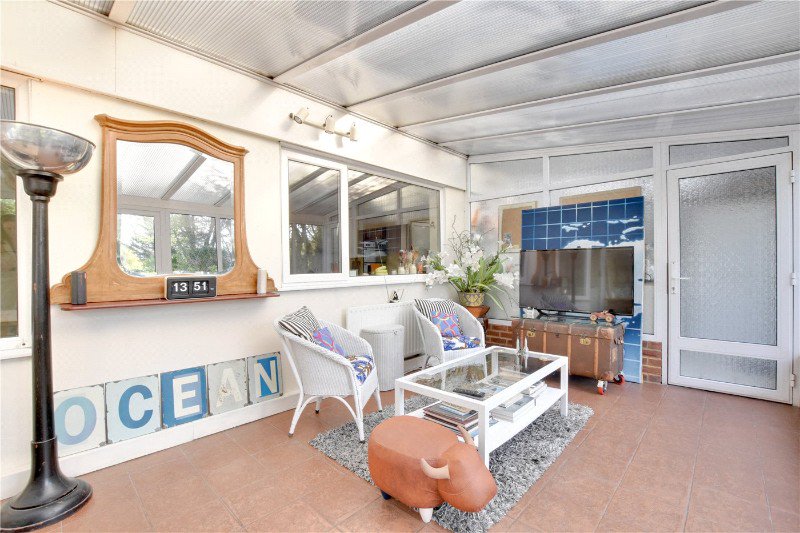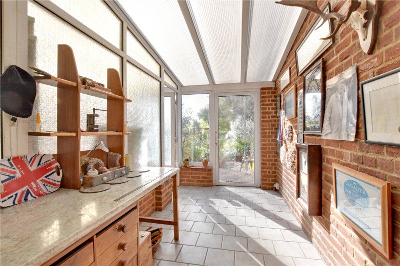 Set well back behind a broad drive and planted front garden, the house opens to a generous reception hall. A bright front sitting room with deep bay and fireplace (about 17'0 x 11'8) is balanced by a separate dining room (11'4 x 14'6) that flows into a full-width garden room/conservatory (24'6 x 10'0), an effortless everyday link to the outside. The kitchen (13'10 x 9'6) sits alongside with a utility and side door, plus a guest WC. There is internal access to the 19'8 integral garage and a useful adjoining workshop.