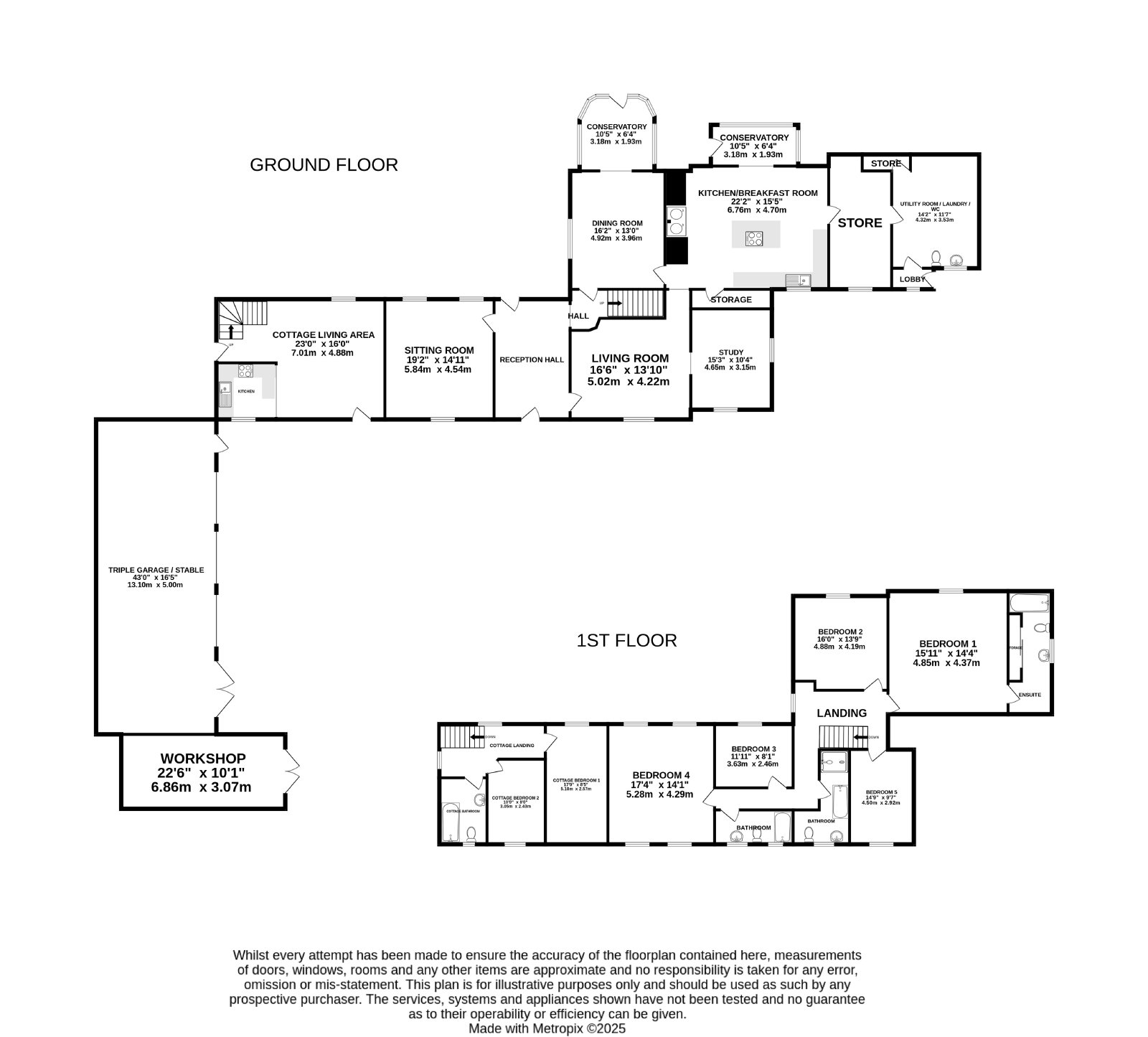 Approached via a gated driveway, the property makes an immediate impression. The drive provides extensive parking for numerous vehicles and leads to an outstanding triple garage/stable block, measuring approximately 43’ x 16’5”, together with an additional workshop measuring 22’6” x 10’1”. These buildings are currently utilised for garaging and storage but offer excellent potential for conversion (subject to necessary consents) — perhaps into a home office suite, gym, studio or even further accommodation if required.