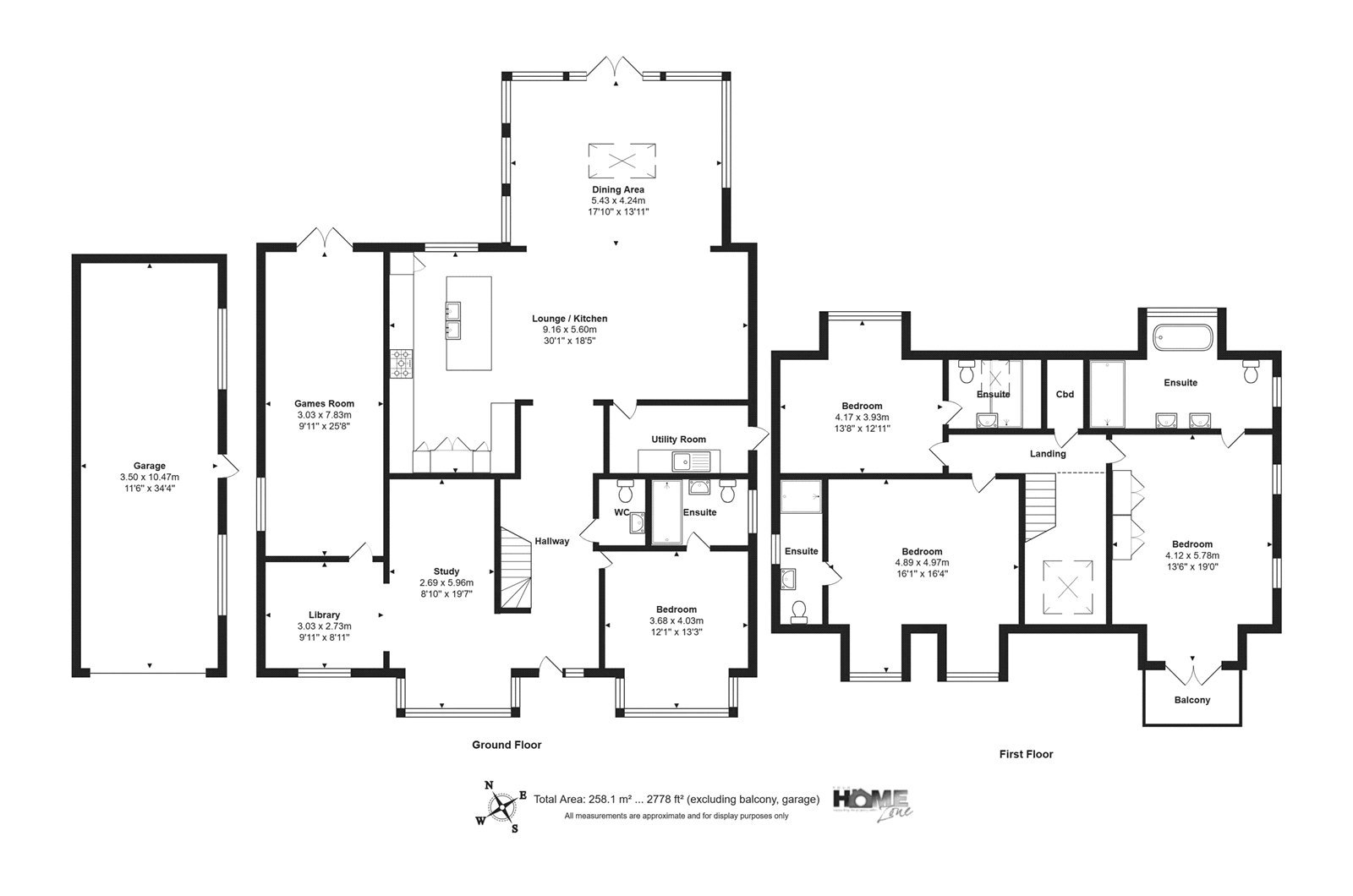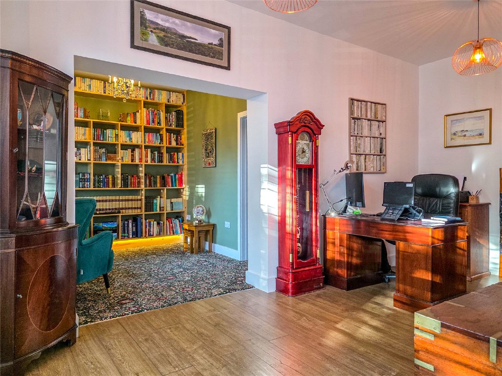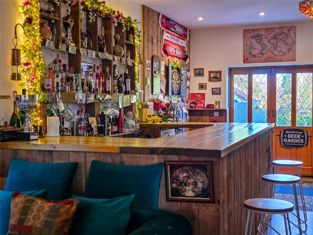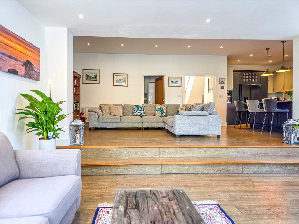 Entry via front door to an impressive, vaulted entrance hall with views right through to the rear garden. The open-plan kitchen/living area is particularly impressive, spanning in excess of 30’ across. The kitchen features plenty of storage with bespoke cabinetry to include wine rack, a range of appliances, hot water tap, and central island with breakfast bar. The living area steps down to a stunning orangery dining room, seamlessly linking the inside to the rear garden. Further accommodation on the ground floor includes a large double bedroom with ensuite and a study, ground floor WC library, pub/games room and utility room complete the ground floor accommodation.