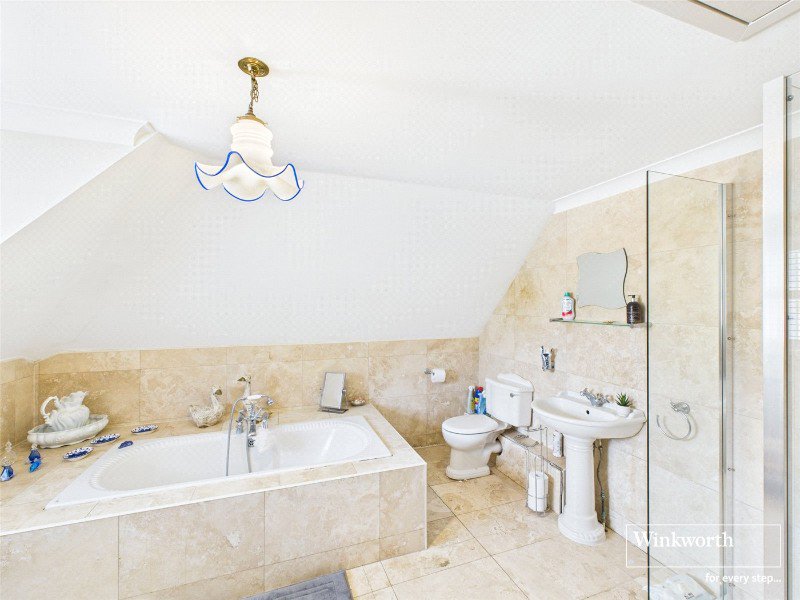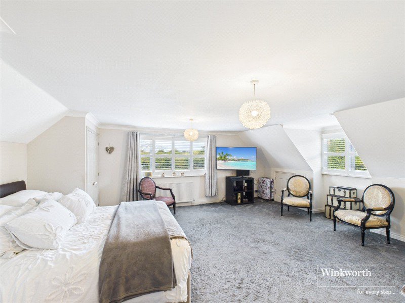 Upstairs, there are four generous double bedrooms, all beautifully presented and featuring built-in wardrobes. The principal suite is particularly impressive, with its own dressing room and a luxurious en suite bathroom complete with freestanding bath and separate walk-in shower. The remaining bedrooms are served by a stylish family bathroom, also with bath and shower.