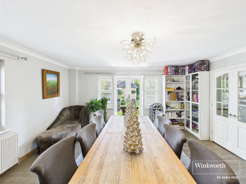 Inside, the sense of space and light is immediate. The ground floor flows beautifully, featuring three well-proportioned reception rooms. The magnificent 456 sq. ft. drawing room, with its triple aspect and central fireplace, forms the heart of the home—a wonderful setting for both family relaxation and entertaining. The formal dining room opens directly to the garden via French doors, while double doors connect it seamlessly to the open-plan kitchen and breakfast room, ensuring a sociable and versatile layout.