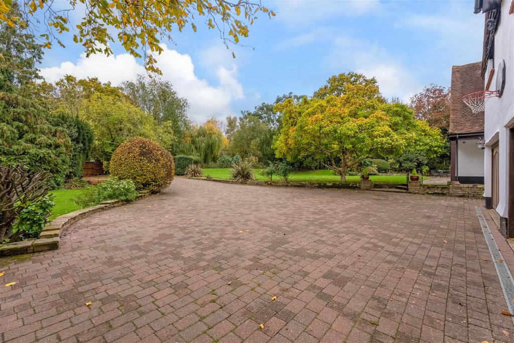 The wraparound landscaped gardens provide a peaceful sanctuary, with mature planting, a manicured lawn, and three elegant patio areas ideal for al fresco dining. A private driveway and two integral garages offer ample off-street parking.