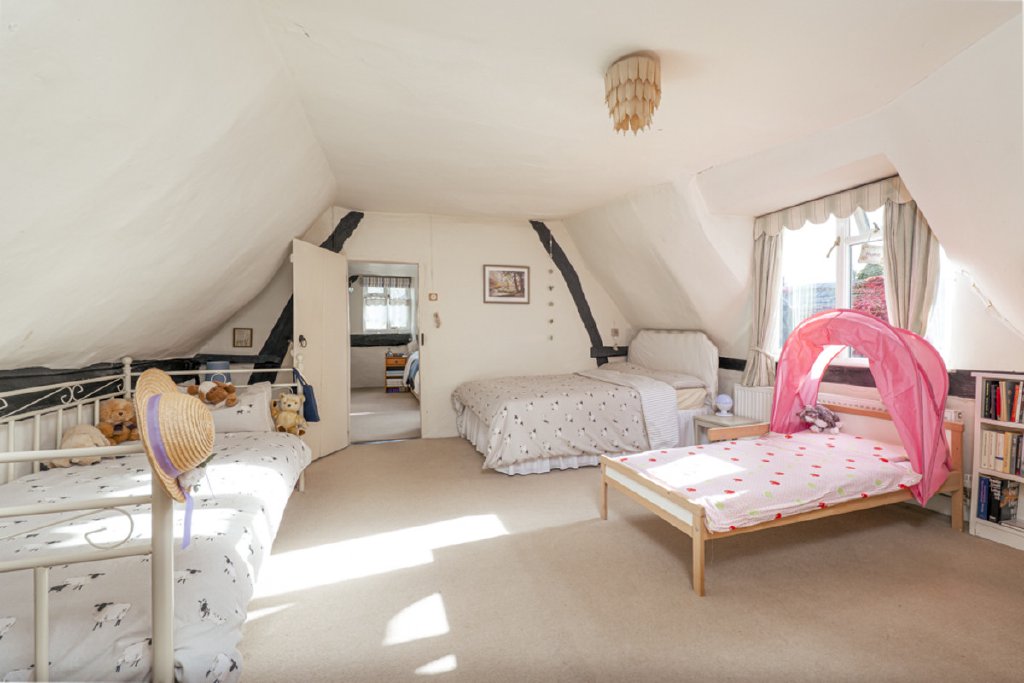 There are three double bedrooms upstairs of which two are currently interconnecting and a family bathroom. Bedroom one, in the extension is south facing with dormer windows and French doors to a Juliet with panoramic views over garden and open countryside. Bedrooms two and three have double glazed windows and exposed black beams showing the structure of the cottage.