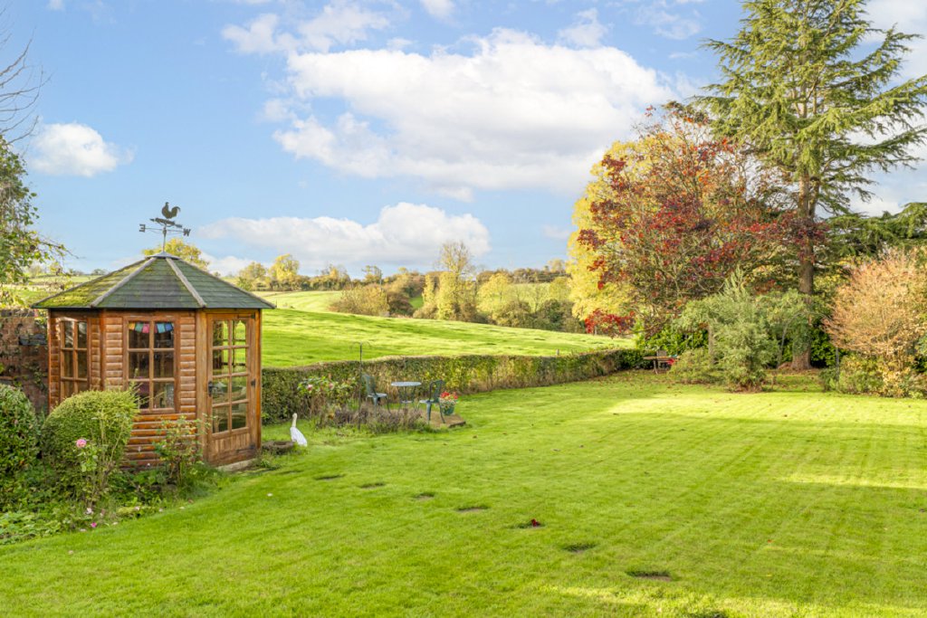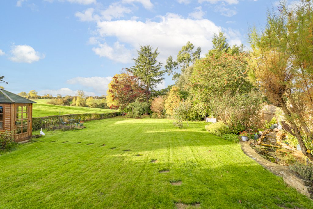 Double wrought iron gates give access into the side of the property leading in turn to the delightful lawned garden stocked with mature flower beds and a great variety of trees which colour all year round. There is a shed, a pond with sitting area and a summer house with stove and electric lighting. The garden has an unspoilt view over fields and is idyllic at any time of the year, a large garage is at the side of the house and there is space behind for an extension.