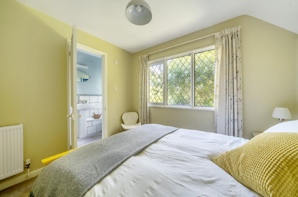 Through an archway lies the impressive master bedroom, a dual-aspect space with extensive built-in storage. The en-suite bathroom is beautifully appointed, featuring both bath and shower, and enjoys pretty garden views.