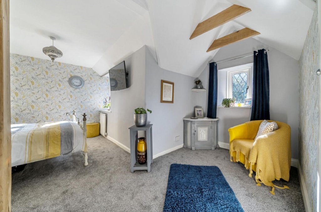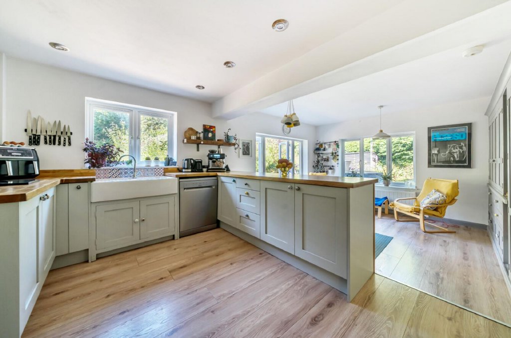 The spacious open-plan kitchen / breakfast room is fitted to a high standard, offering stylish built-in storage and lovely views over the garden. From here, a door leads to a vaulted cellar, an unexpected feature currently used as a home gym but easily adaptable for a range of uses.