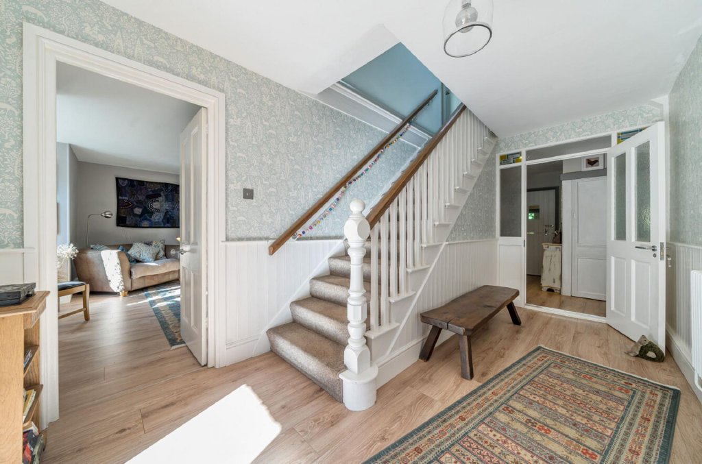The front door opens into a welcoming and generous hallway filled with natural light from windows on either side, complemented by a decorative stained-glass panel that enhances the home’s character and warmth.