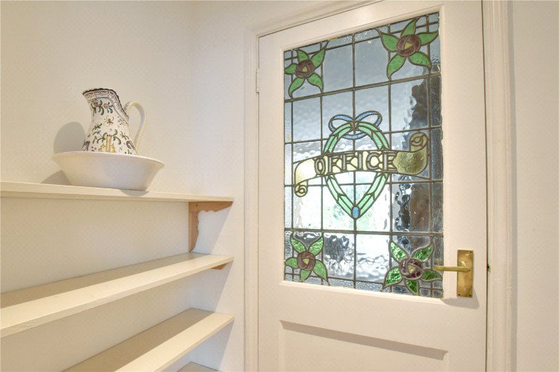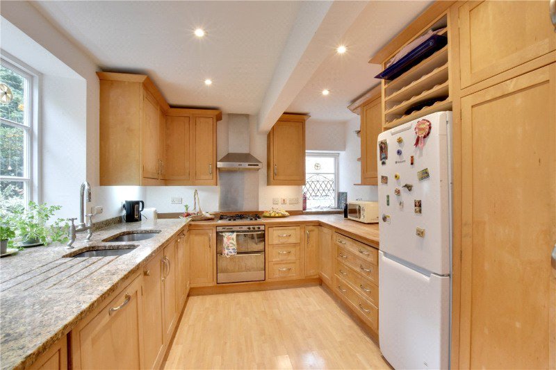 Approached via a private porched entrance, the ground floor opens to a large hall leading to a superb 20'6 x 18'5 reception overlooking greenery , which flows into the breakfast room and on to the spacious kitchen with generous worktops of granite and cherry wood, and many maple covered cupboards , that serves the entertaining spaces with ease, complemented by a utility room, useful storage and shower room with WC.