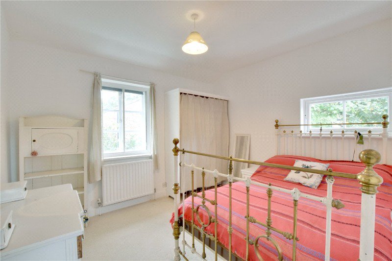 On the upper level are four bedrooms and a family bathroom. The showpiece, which was probably used as a ballroom or billiard room to the main house, is a magnificent principal reception room, rich with period detail, with the elegant original tiled fireplace with overmantel and the original wooden floor boards and panelled walls that rise to an extraordinary vaulted/coffered ceiling with ornate cornicing, illuminated by daylight flooding in through large casement windows. It has recently been used as a fifth master bedroom. Outside there is direct access to a kitchen garden, ample shed and an intimate sheltered patio for outside dining. This leads to a beautifully tended communal lawned garden framed by established trees, and a small woodland, offering a rare sense of seclusion and quiet peace, so close to village life.