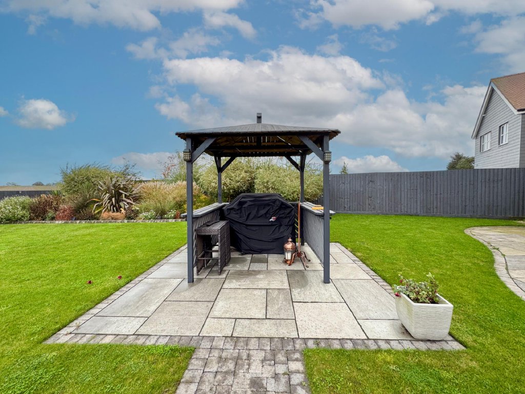 STEP OUTSIDE The garden is a wonderful feature of this home, offering a generous and private space that feels both peaceful and inviting. A large patio creates the perfect spot for outdoor dining and entertaining, while the expansive lawn provides plenty of room for family activities. Mature planting adds colour and character, giving the garden a sense of depth and seclusion. Beyond the boundary, open countryside stretches out, creating uninterrupted views and a truly relaxing backdrop.