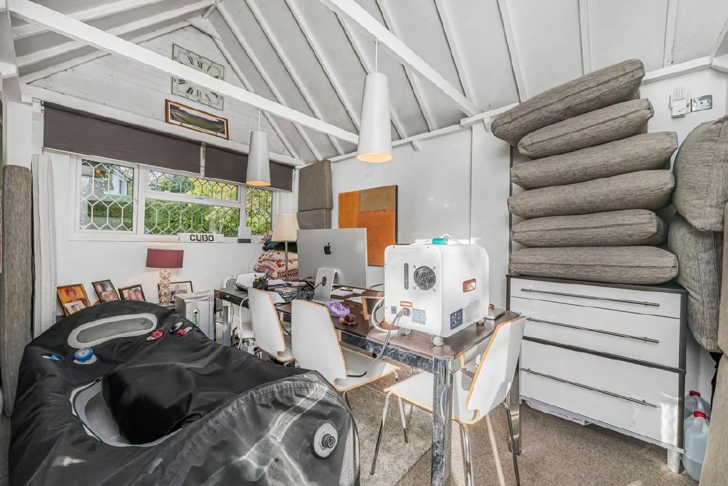 A detached garden room adds further versatility, whether used as a home office, a personal gym, or a creative studio. A generous driveway provides parking for multiple vehicles, enhancing the practicality of this exceptional home.