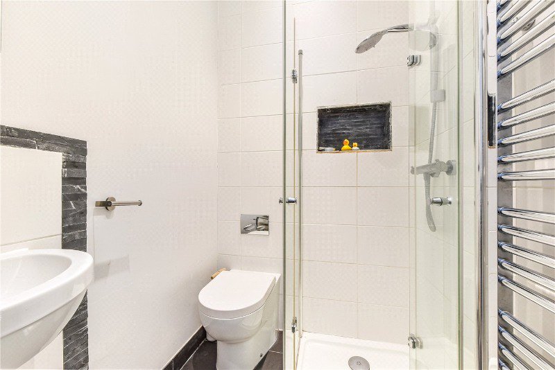 Bathrooms throughout the property are finished to a high standard, combining contemporary design with classic elegance. The family bathroom features grey subway tiling, a deep bathtub, and sleek fittings, while the third bedroom en-suite shower room offers a modern, minimalist look with white tiling and dark stone accents. Completing the home is a private courtyard garden — a tranquil, low-maintenance retreat with rattan seating, potted greenery, and festoon lighting, offering the perfect setting for outdoor dining or quiet relaxation.