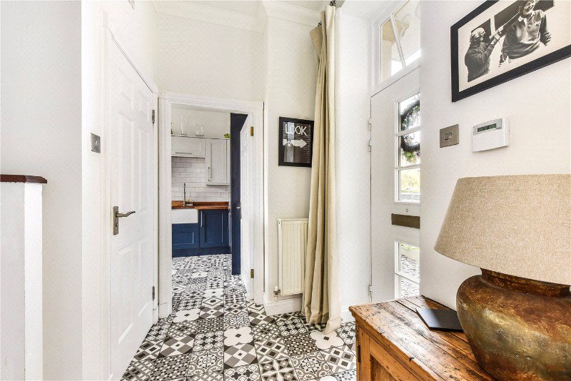 Set within an attractive red-brick building, this elegant home immediately impresses with its classic Georgian-style façade. The property has sash windows, manicured hedging, and wrought-iron railings framing the entrance. Stepping inside, a bright hallway with patterned monochrome tiles and crisp white walls sets the tone — stylish, welcoming, and thoughtfully designed. The layout feels open and inviting, with sightlines leading directly through to the kitchen.