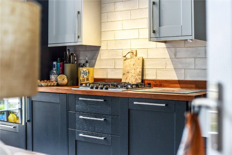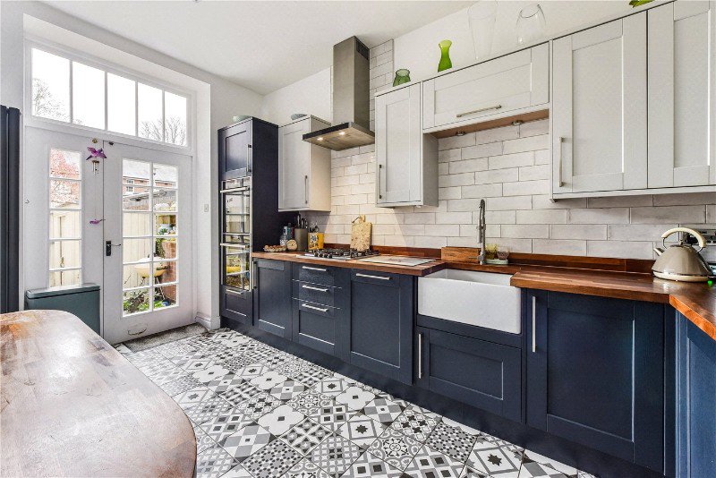 The kitchen forms the heart of the home — a striking, contemporary space finished in rich navy cabinetry with sleek chrome details, warm wooden worktops, and white metro-tiled splashbacks. High ceilings and French doors leading to the garden flood the room with natural light. The adjoining dining area continues the same monochrome flooring, creating visual continuity and a calm, cohesive aesthetic. Clean white walls and large sash windows make this space perfect for relaxed family meals or elegant entertaining.