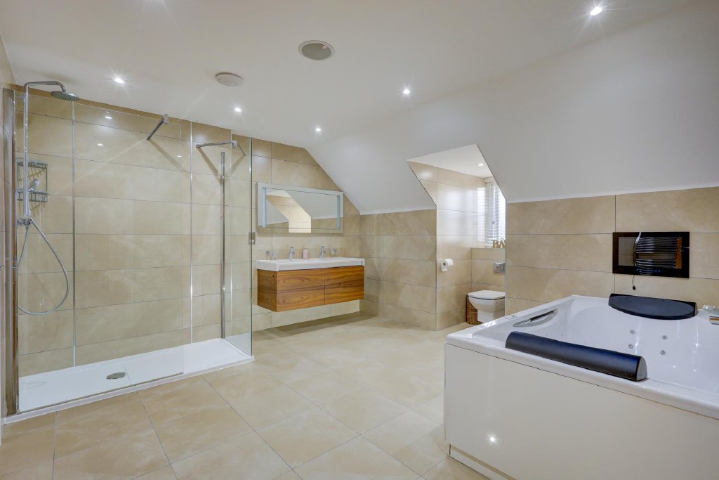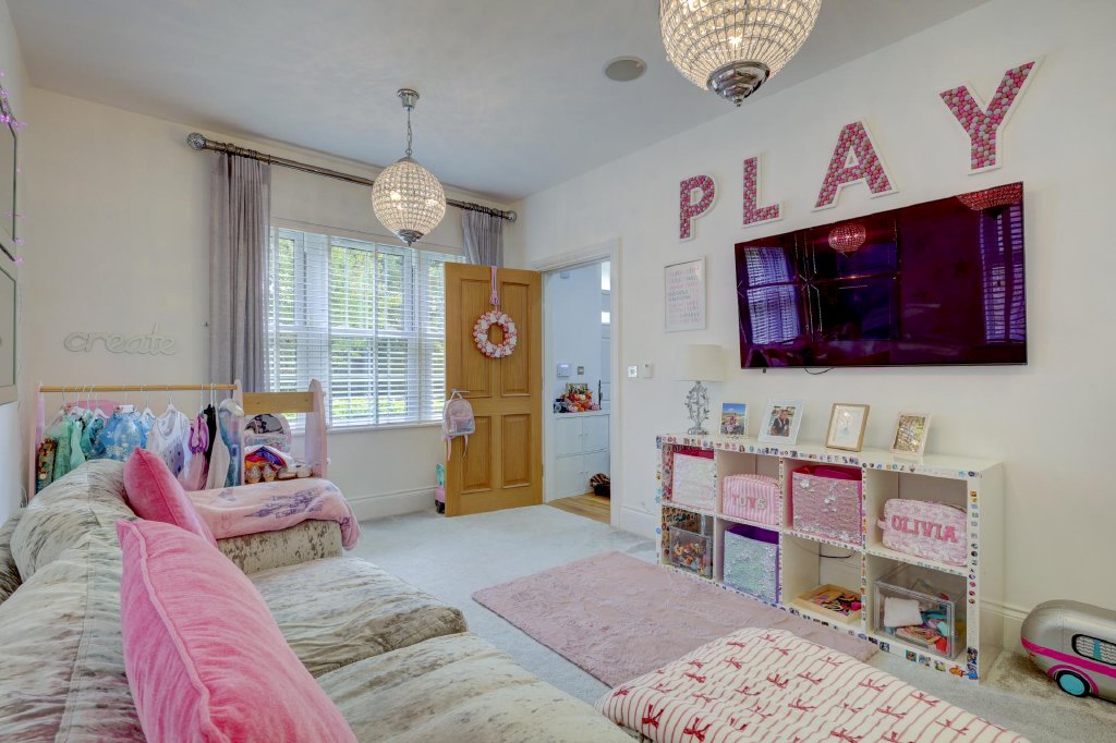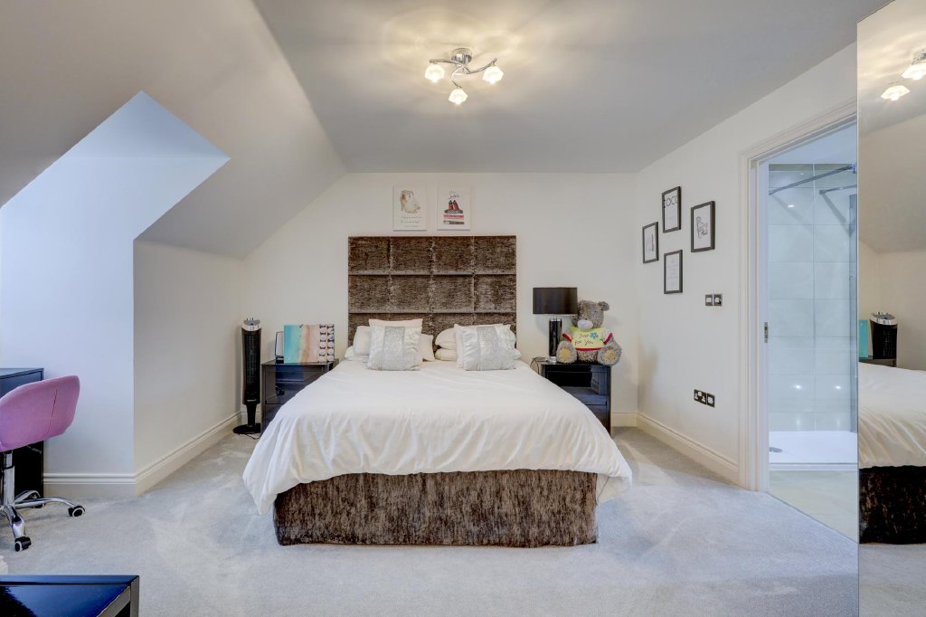 The first floor galleried landing leads to three double bedrooms including the luxurious principal bedroom with a beautifully fitted dressing room, a bay with French doors to a Juliette balcony providing views over the garden and a stunning en-suite bathroom with a large bath, a walk-in double shower and twin vanity basins. The other two bedrooms feature en-suite shower rooms and fitted wardrobes. On the second floor there are three further double bedrooms, including two with fitted cupboards and a spacious Jack and Jill bathroom incorporating a Jacuzzi bath with access from the landing and from one bedroom.