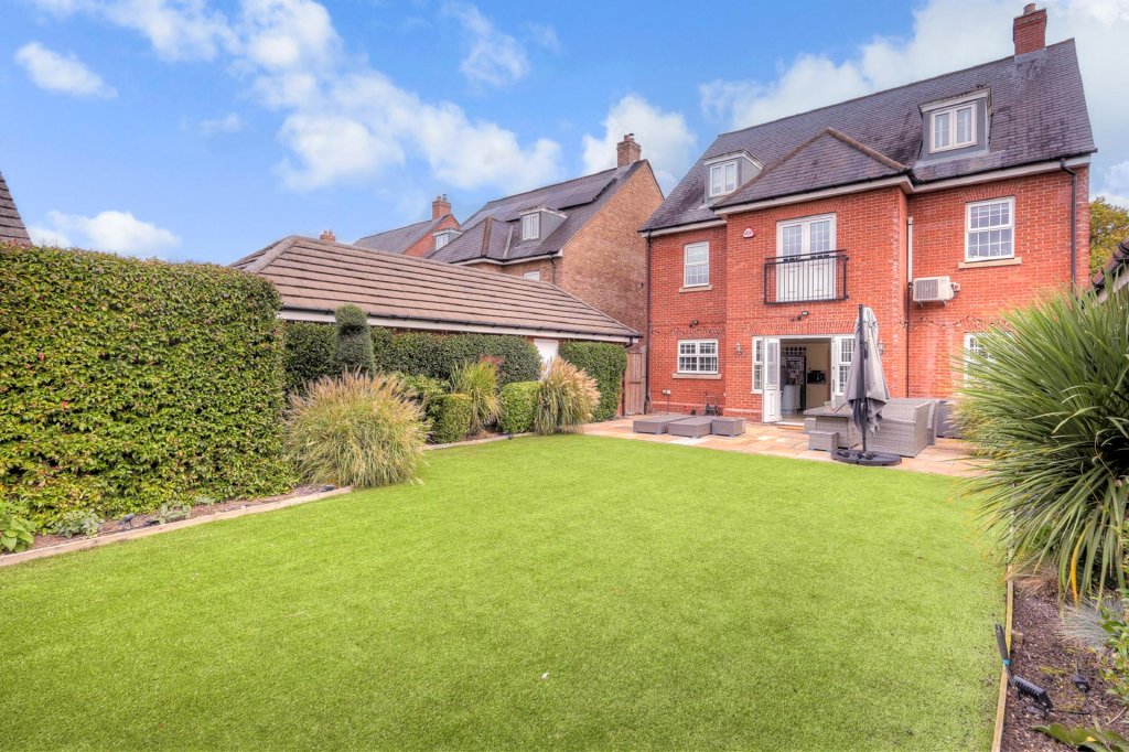 If you are looking for an easy to manage garden designed for outdoor entertaining, this is it. A large terrace spans the width of the house and is ideal for al fresco dining and family barbecues. This is bordered by a vast expanse of artificial grass that is ideal if you have dogs and it is edged by shrub beds, high hedging and fencing.