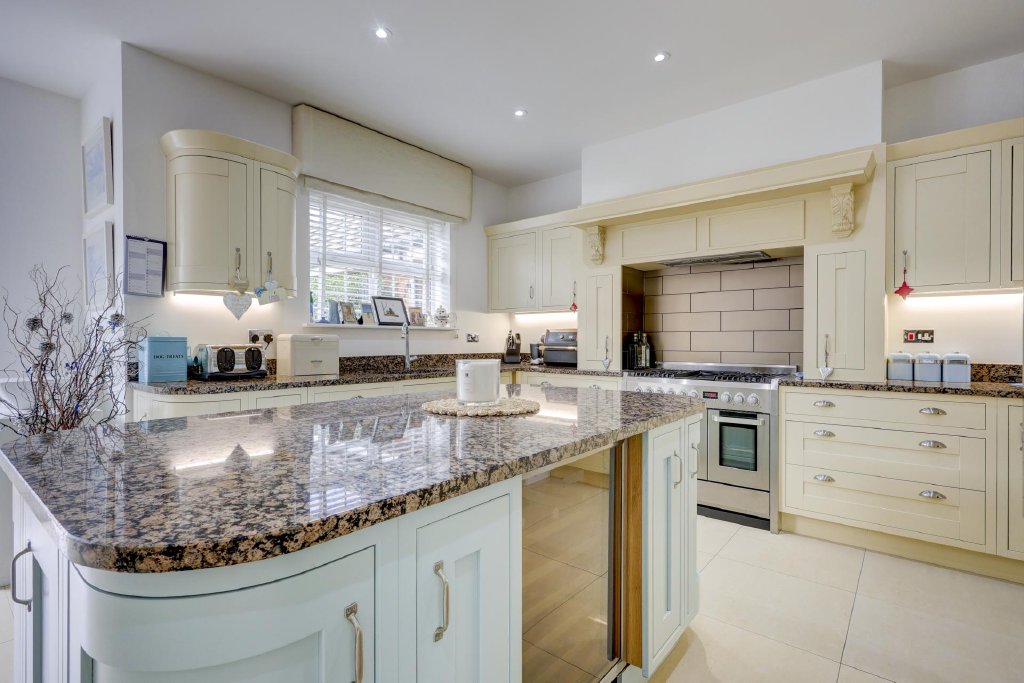 The spacious living room features a stone fireplace with a flame effect gas fire flanked by attractive glass shelving creating a delightful focal point. It has double doors to the impressive open plan kitchen breakfast room. This features a porcelain tiled floor, a charming bay with French doors to the rear terrace, a large dining area and a superb kitchen. This includes an inset range cooker and shaker style units with granite worktops housing a microwave, an American fridge freezer, coffee machine and dishwasher as well as a central island with storage units and a wine cooler. There is an adjacent fitted utility room with matching units and laundry facilities as well as a door to the driveway.