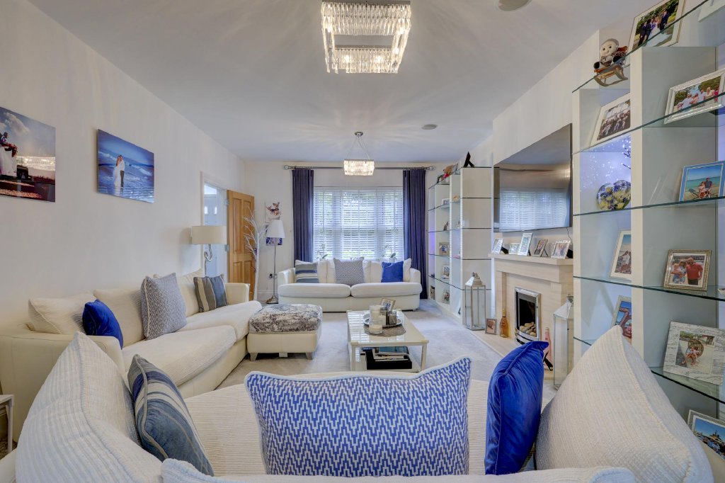 There is a driveway for off road parking and a tandem double garage at the side. While a pathway flanked by attractive floral borders leads to the front door that opens into the immaculate hallway with stairs to the first floor, an understairs cupboard, a contemporary cloakroom and access to all the ground floor accommodation. This includes a good sized family room just inside the front door, which would make an excellent office as it is easily available for business visitors.