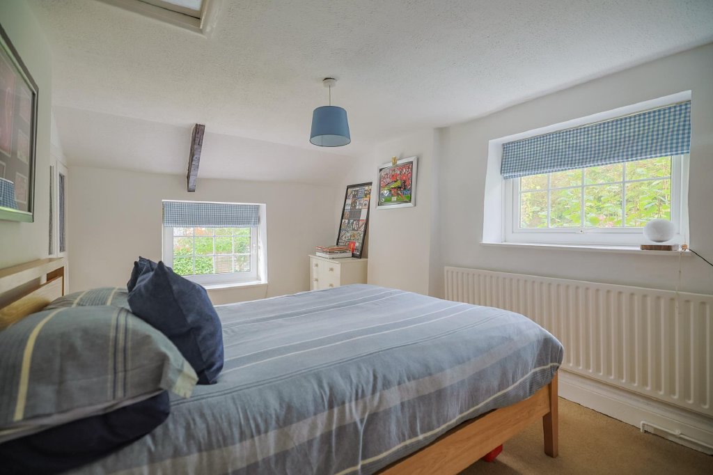 Another generous double bedroom with dual-aspect windows overlooking the front courtyard, carpeted flooring, vaulted ceiling, exposed beams, and built-in wardrobes with hanging rails and shelving.