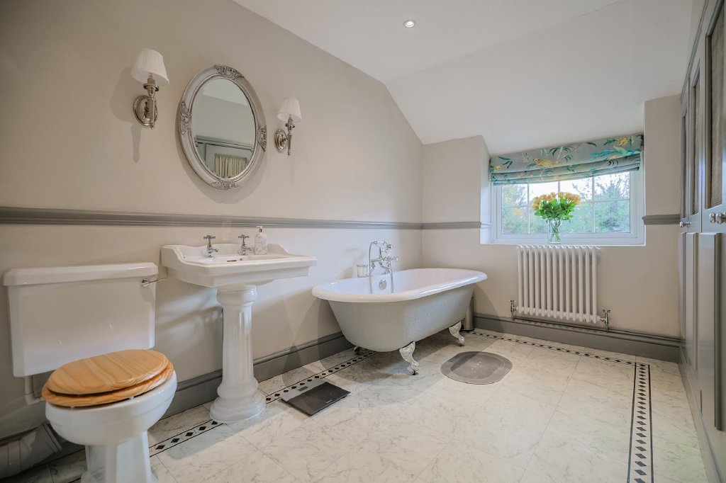 Double doors from the family area lead into the conservatory, a bright and airy space with windows overlooking the stunning grounds and double patio doors to the rear. Terracotta tiled flooring complements the room’s natural charm, creating a perfect spot to unwind with a nightcap or enjoy the surrounding views.