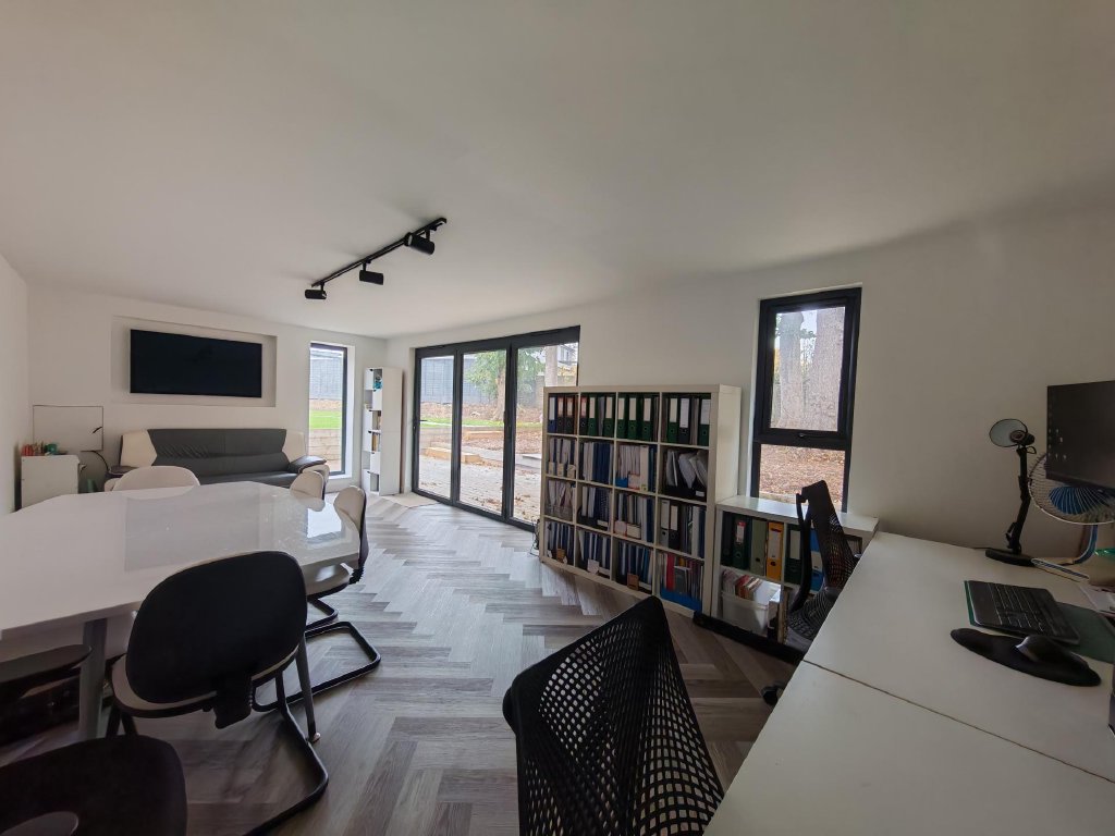 DETACHED HOME OFFICE 22' 9" x 11' 4" (6.93m x 3.45m) Herringbone wood laminate flooring, power points, ceiling spotlights, bi-folding doors leading to decked area, tall double glazed windows to front aspect overlooking garden, recess with bracket and wiring for all mounted T.V., cupboard housing electric consumer box.