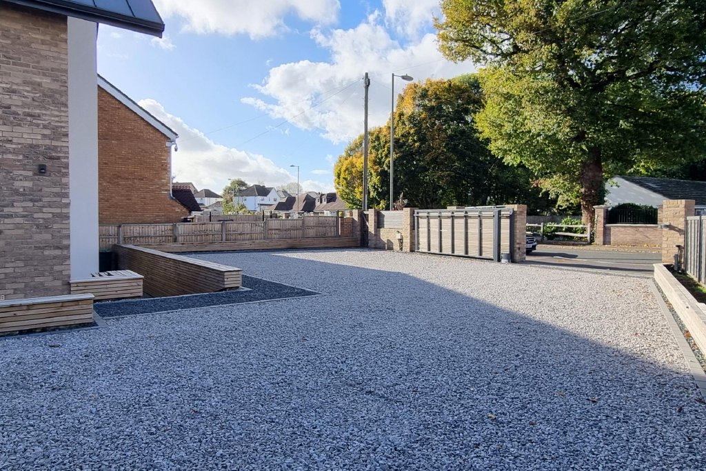 ENTRANCE Brick retaining wall with fencing over, sliding remote control gate providing vehicular access leading to L shaped shingle driveway with off road parking for numerous cars, enclosed by fence panelling on both sides, automated lighting, to the front is a sloping pathway with wood borders to either side leading to the front of the house, to the left hand side is a further shingle pathway, main front door with brushed steel furniture and security spy-hole leading to: