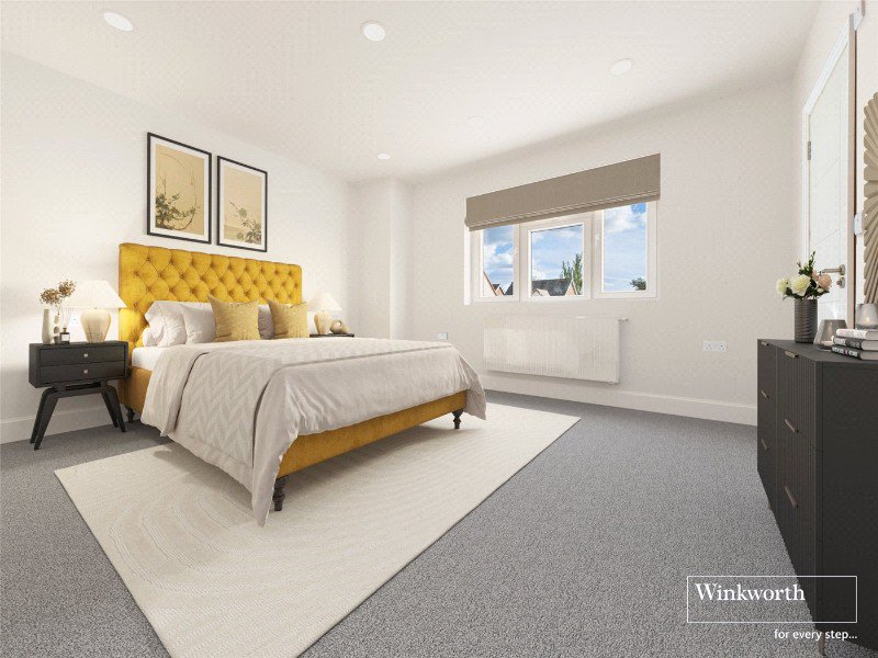 splashback behind the hobs. Striking waterfall-edged breakfast bars feature in selected homes, a high spec. selection of fully integrated appliances, including ovens, hobs, extractors, microwaves, dishwashers and fridge-freezers. The elegant bathrooms and en-suites are all fully tiled and feature, contemporary white sanitaryware complemented by wall-hung basins with sleek vanity storage, chrome and brushed brass fittings paired with thermostatically controlled showers and baths. There are 3 detached 4 bedroom, 3 bathroom homes, a three bedroom, 2 bathroom detached home and a pair of 3 bedroom, 2 bathroom homes. These contemporary homes are ideally located for family living. Register your interest with Winkworth Estate Agents who will provide further details and will notify you of upcoming launch events.