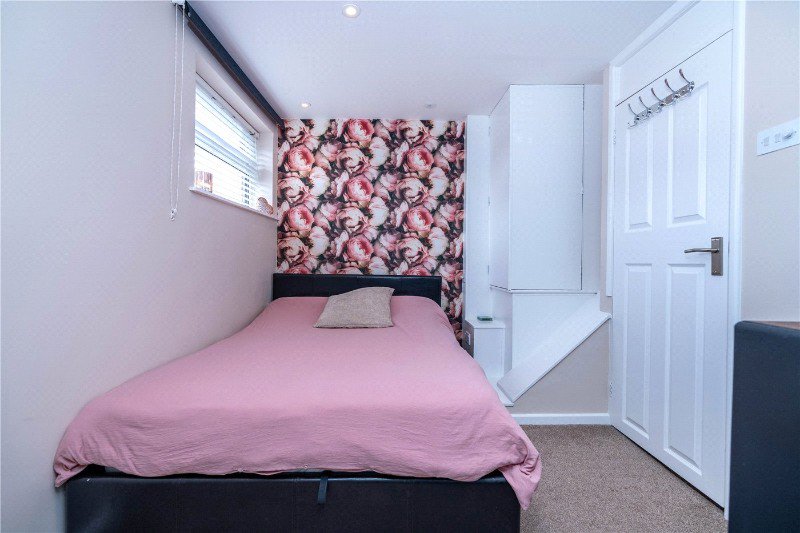 At the rear, the open-plan dining kitchen is the real heart of the home. It’s fitted with a range of white units and complementary worktops, with plenty of space for a family dining table. Patio doors open directly onto the garden, making it ideal for summer gatherings. A useful utility area and a spacious family bathroom with a corner bath complete the ground floor. In the kitchen there is an understairs pantry with lighting.
