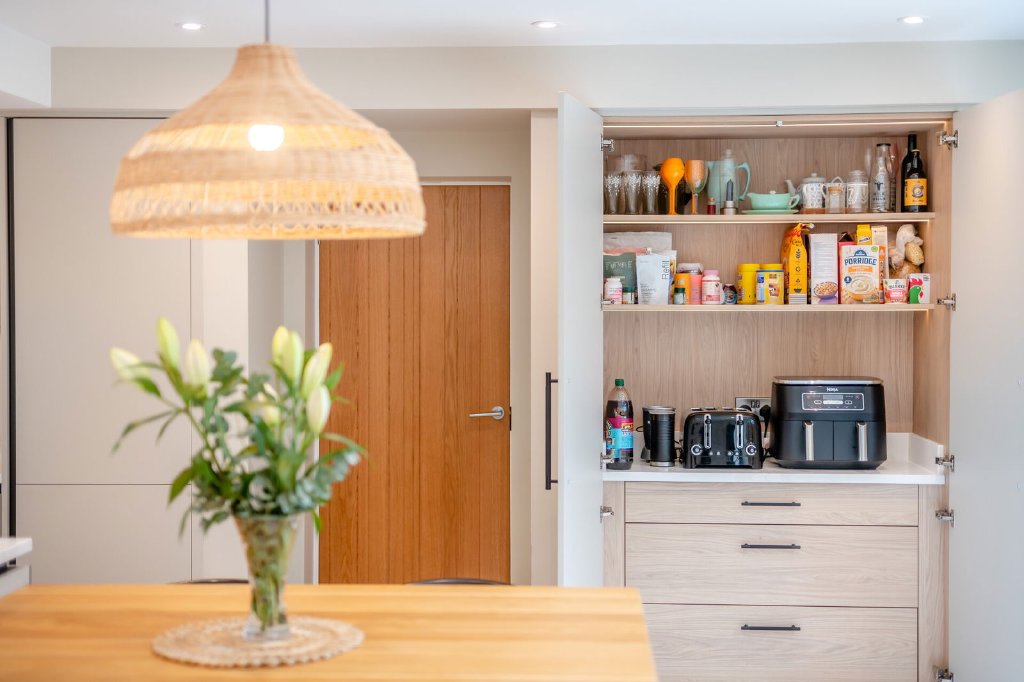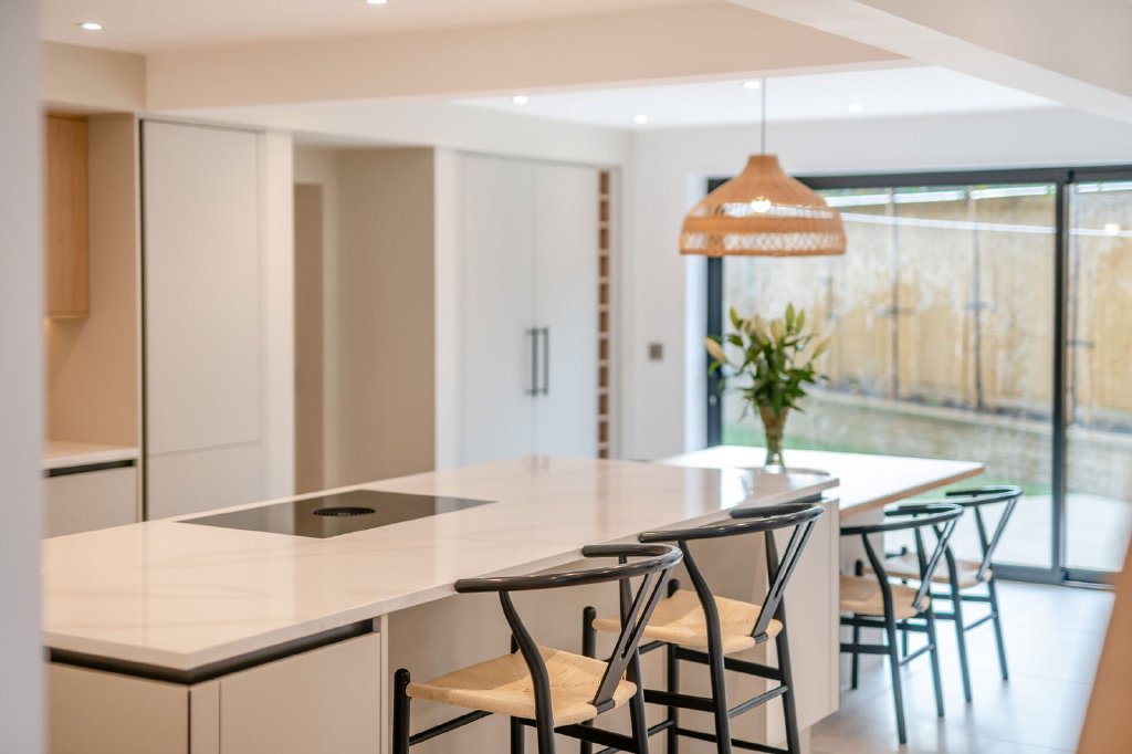 At the centrepiece, the bespoke Daval kitchen embraces a Scandinavian aesthetic, with clean lines, soft textures, and designer detailing. Integrated appliances are discreetly housed within sleek cabinetry, while a large island unit offers additional storage and sociable breakfast bar seating. A statement oak dining table anchors the space with a sense of occasion, allowing for more formal dining without disconnecting from the kitchen’s warmth and flow.