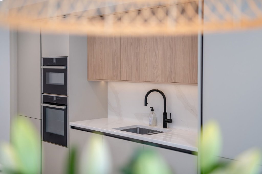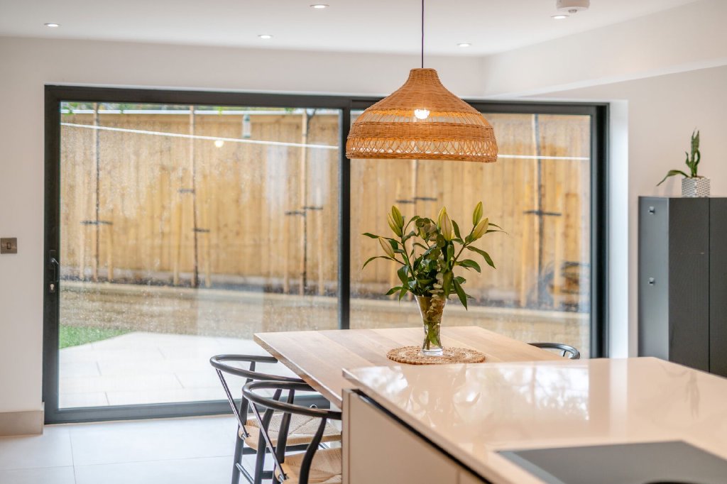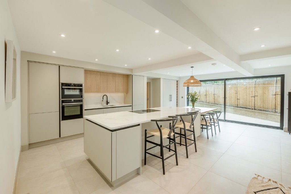 The garden has been beautifully landscaped with a clear emphasis on both practicality and privacy, creating an outdoor space that is as functional as it is visually striking. A sleek porcelain-tiled patio mirrors the high-end finish of the interior kitchen, allowing for seamless indoor-outdoor living when the expansive sliding doors are open — perfect for entertaining or relaxed family life.