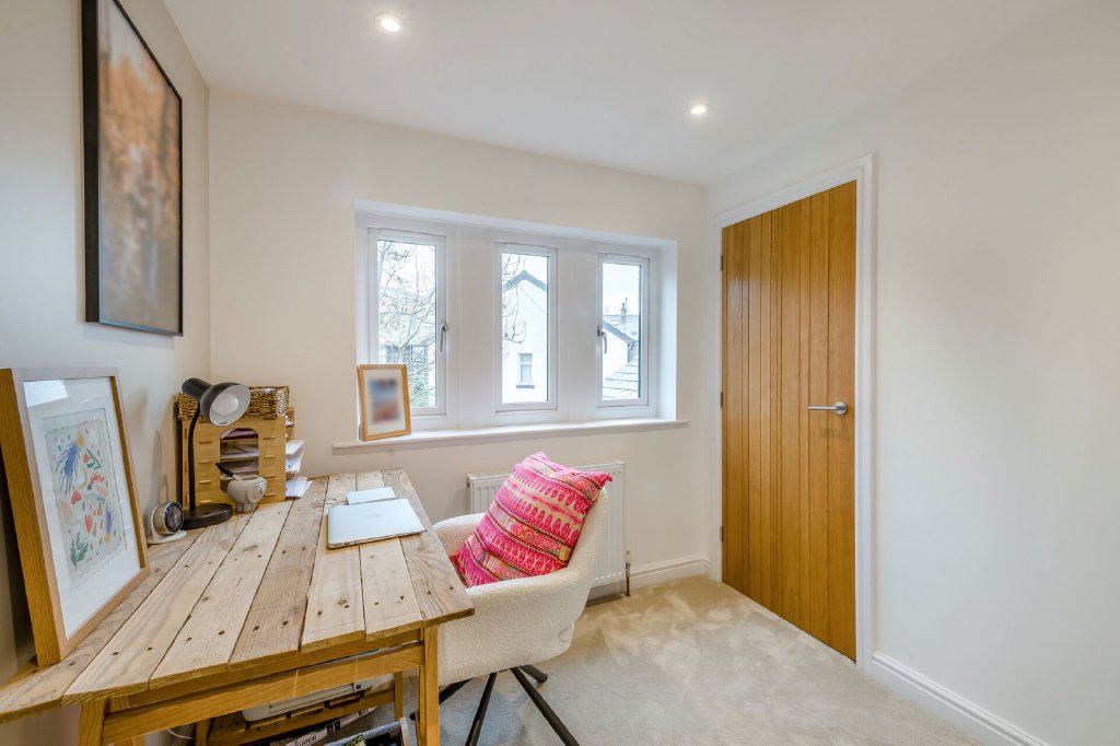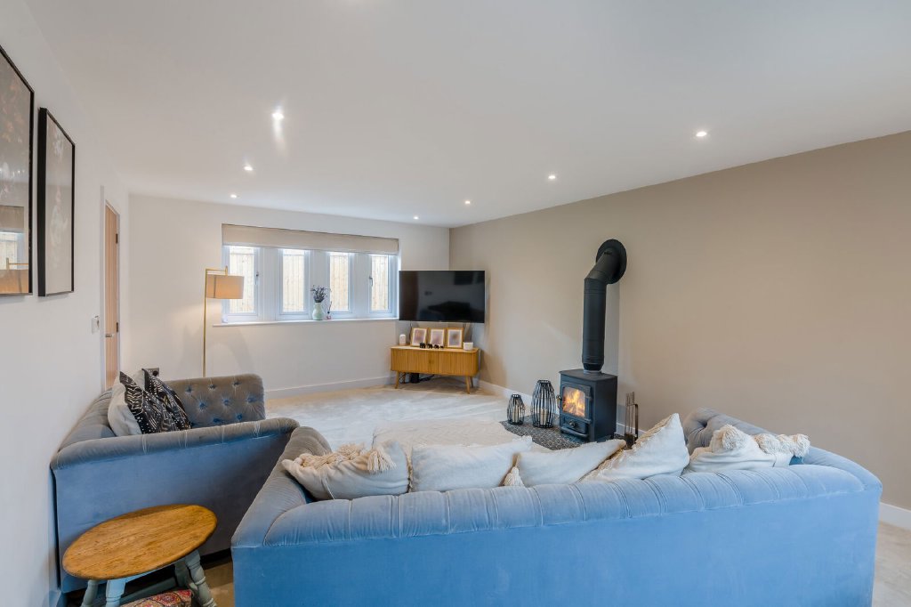 Flowing seamlessly from the kitchen, a cosy sitting room offers a more intimate retreat — perfect for quiet evenings or relaxed conversation. Dual-aspect windows bathe the space in natural light, while a charming log-burning stove adds warmth and character. This inviting room balances comfort and style, making it a treasured corner of the home.