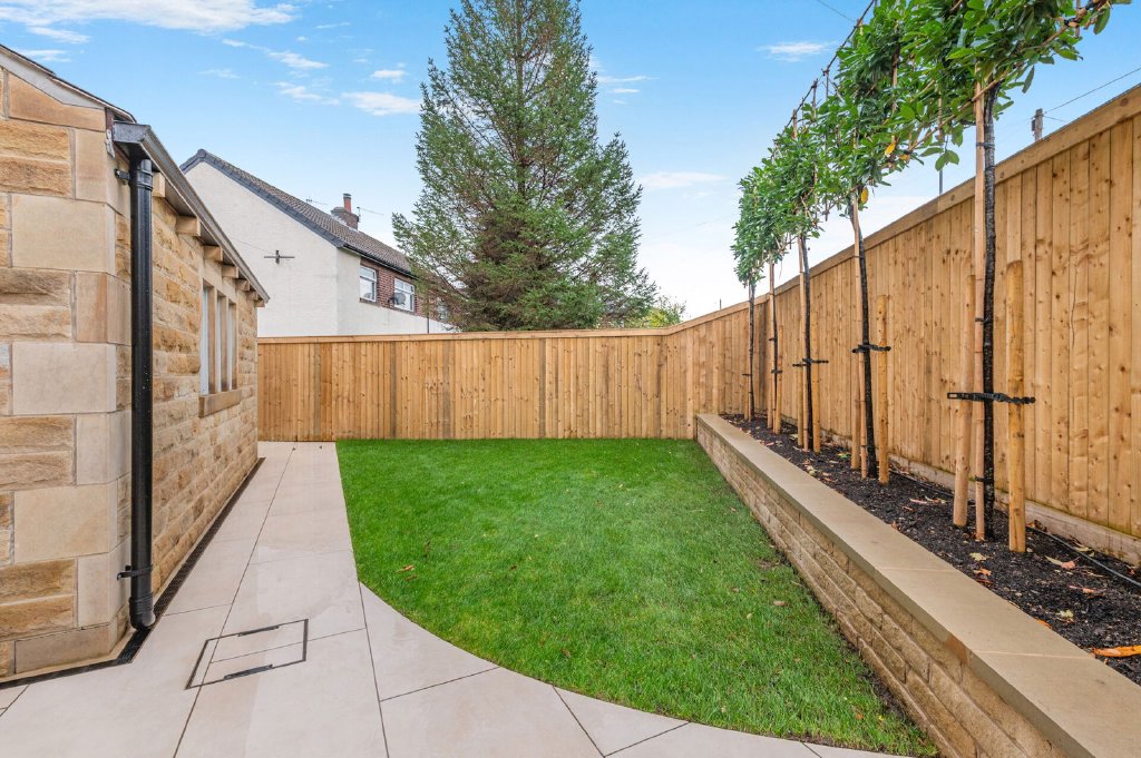 A smart, contemporary fence ensures privacy without compromising on style, softened by premium shrubbery that adds texture and year-round greenery. Beyond the patio, a neatly lawned garden provides space to unwind, while a dedicated play area with wood bark surfacing offers a safe and inviting zone for children.