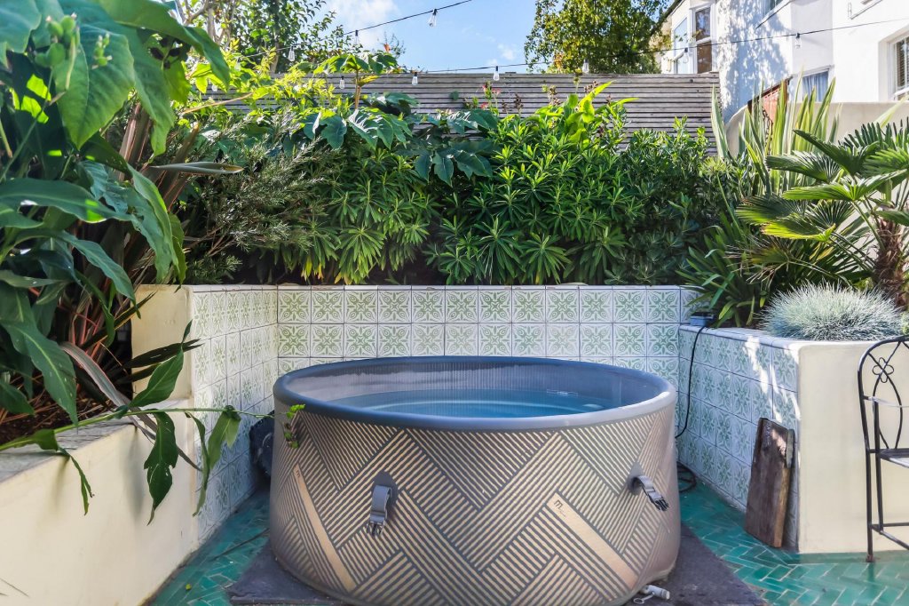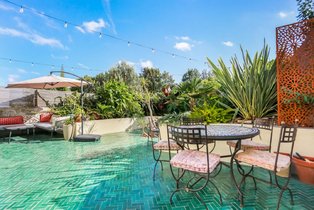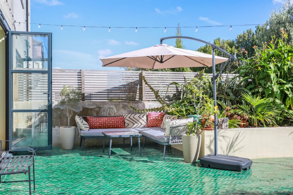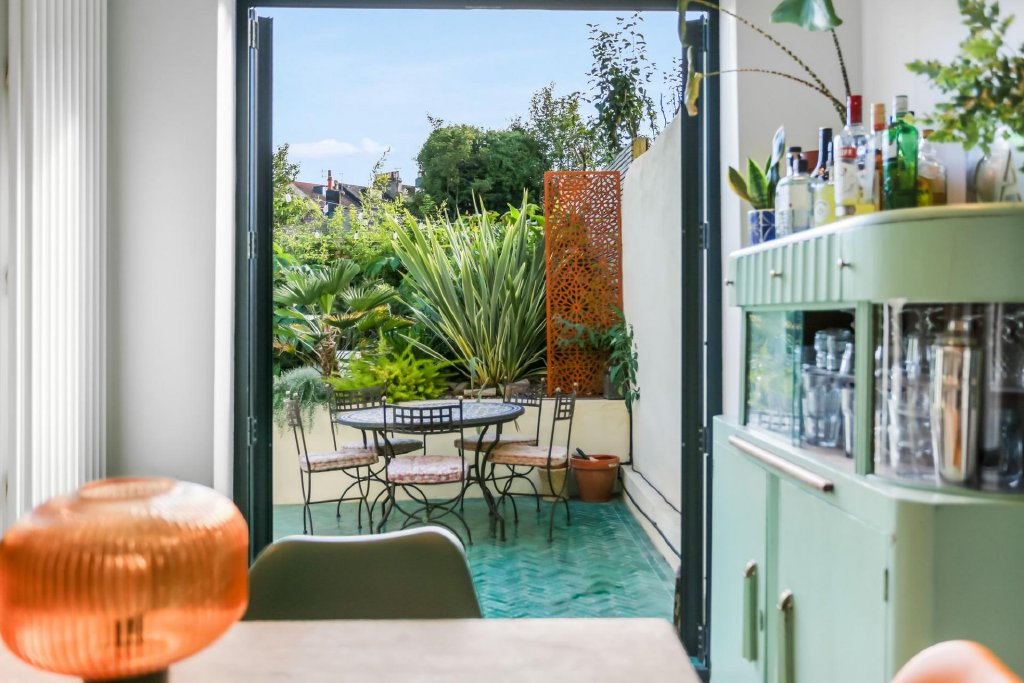 South-facing and beautifully landscaped, this secluded retreat features a beautifully designed terrace, perfect for entertaining or relaxing in style. The striking green tiled flooring creates a vibrant, Mediterranean-inspired backdrop, while the lush planting offers both privacy and a calming natural atmosphere.