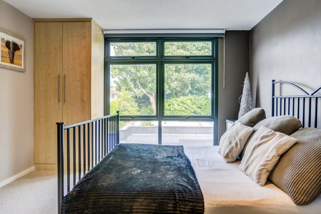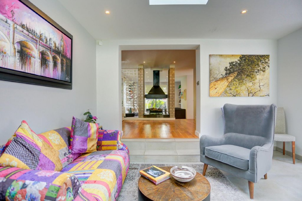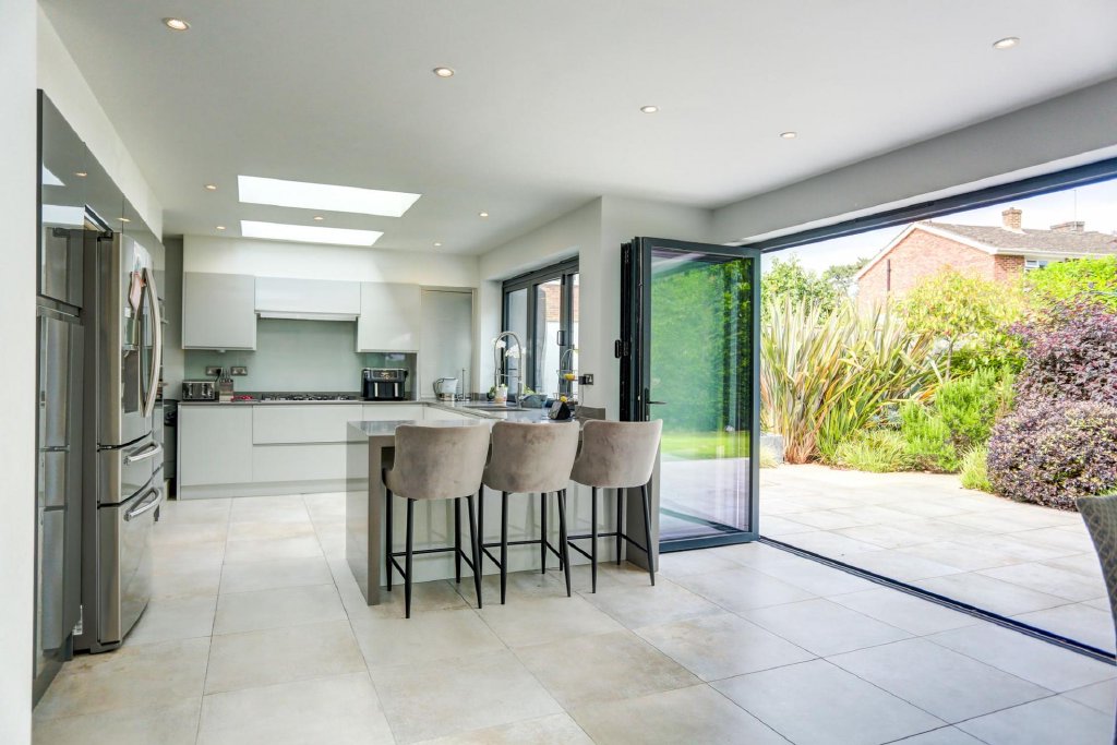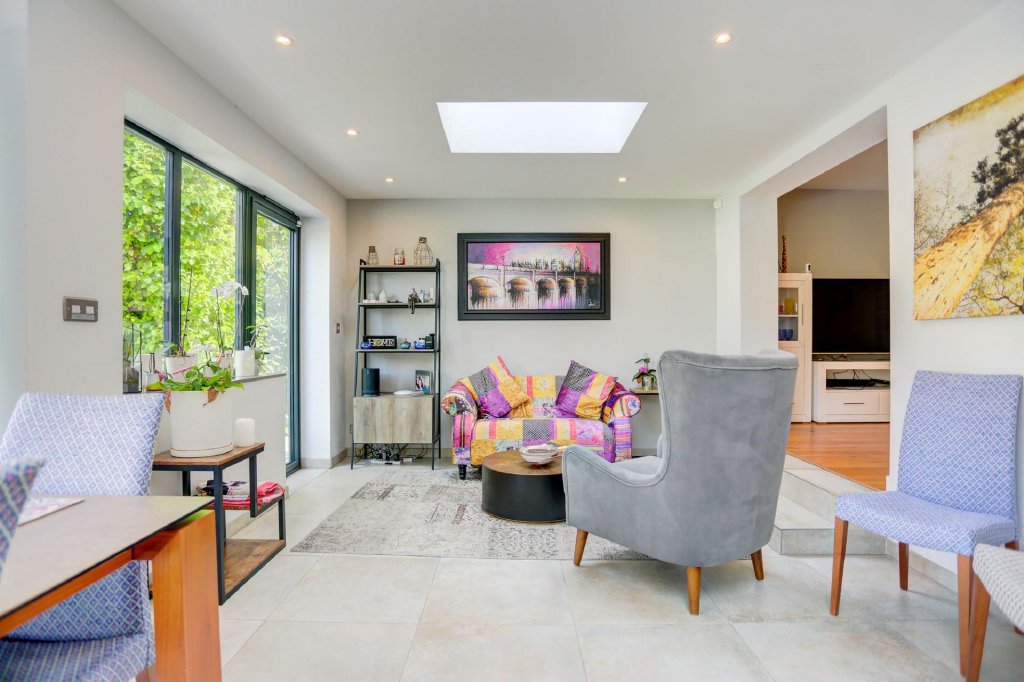 Beautifully lit by a wealth of tri-fold doors, wide windows and tall roof lanterns, the spacious open plan kitchen/dining room that stretches across the full width of this 1970s home engenders an instant wow factor that’s hard to ignore. Fully fitted with sleek grey cabinets and countertops, the contemporary kitchen supplies a wealth of storage and workspace and is well-appointed with an impressive array of integrated appliances that includes dual ovens, a steamer and dishwasher. An under-mounted Franke sink with its eye-catching spray tap is perfectly placed for you to admire the garden when you wash your vegetables, and the gloss countertops wrap-around to form a convenient breakfast bar.