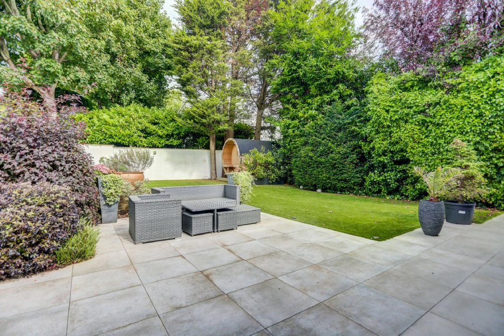 Engendering an easy flowing extension of the open plan ground floor, the grey porcelain tiles of the first-rate kitchen/dining room flow out onto the landscaped terrace seamlessly adding to its formidable footprint. A picture perfect place to relax in the sun and enjoy outdoor meals with family and friends, this idyllic walled garden benefits from plenty of privacy.