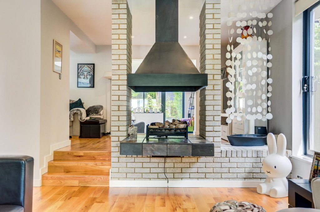 The warm tones of the solid oak floor reach out across the tiers of the large open plan living/sitting room area offering an abundance of space to relax as a family. Effortlessly delineating this dual aspect room, a raised central fireplace adds an instant focal point, while the feature gault brickwork adds to the sense of style.