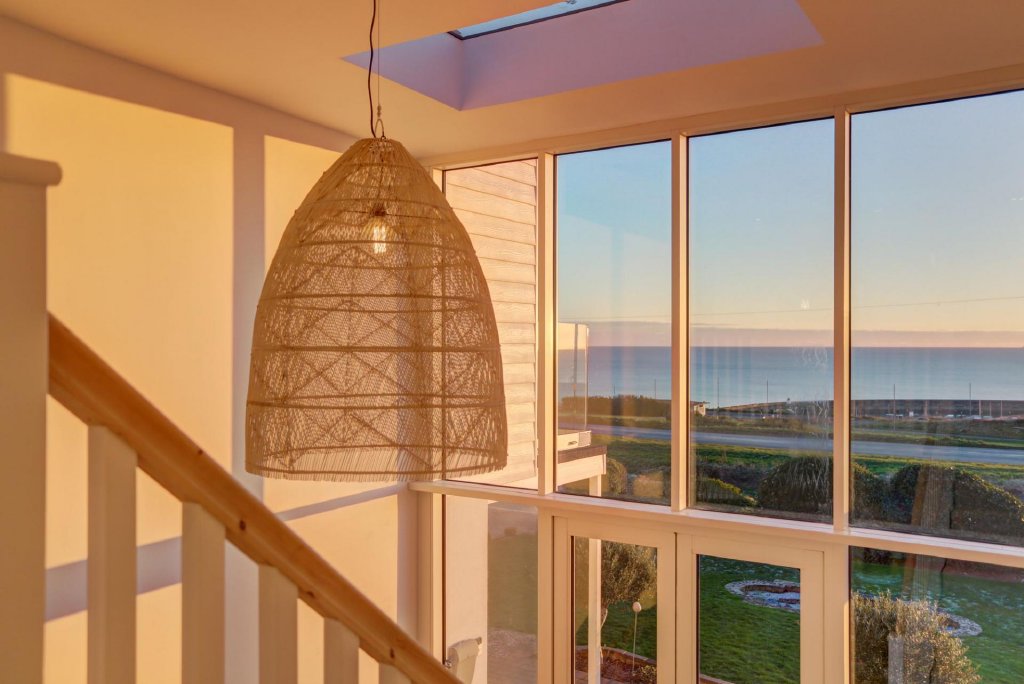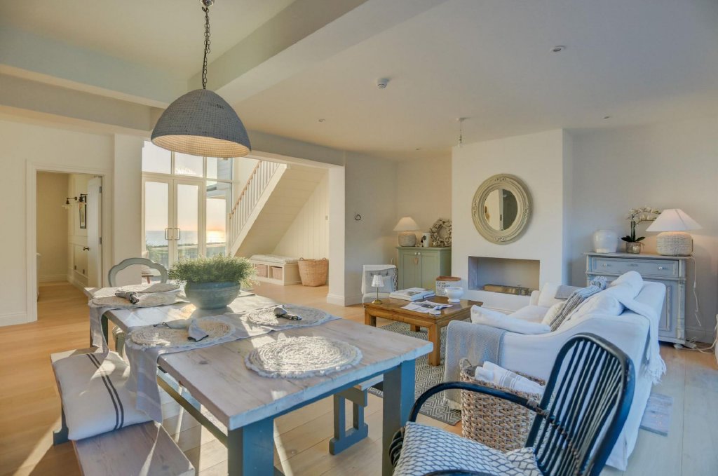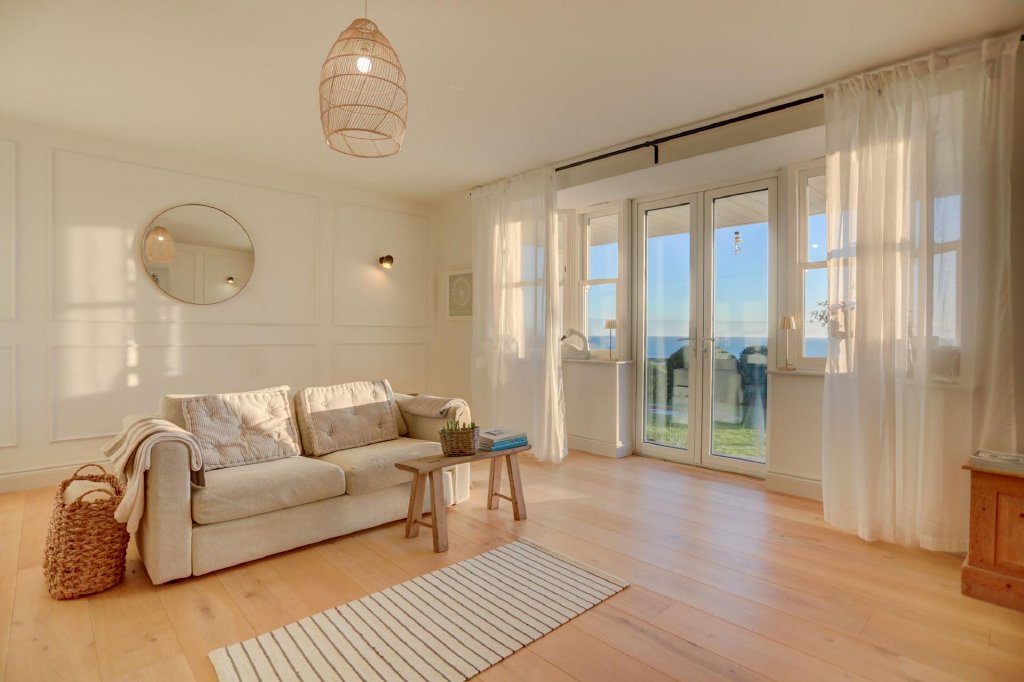 At the front of the home, a separate living room with contemporary bioethanol fireplace and a further formal dining room/play room feature a bay windows with French doors opening directly onto the south-facing front garden, inviting in natural light, garden and sea views.