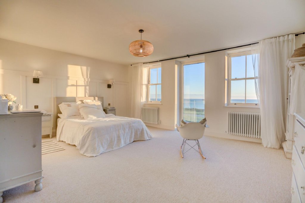 The care and attention woven into every detail of this home is captured on the spacious first-floor landing, enjoying breathtaking, far-reaching view across the English Channel from the glass atrium to the front and light from the two sky lights above. Leading from here are four generously sized double bedrooms, each with its own ensuite bathroom, ideal for a busy family or visiting guests. The two front-facing bedrooms enjoy direct access to private south-facing terraces, complete with sleek glass balustrades that frame the view and invite in natural light as well as larger ensuites with dual sinks.