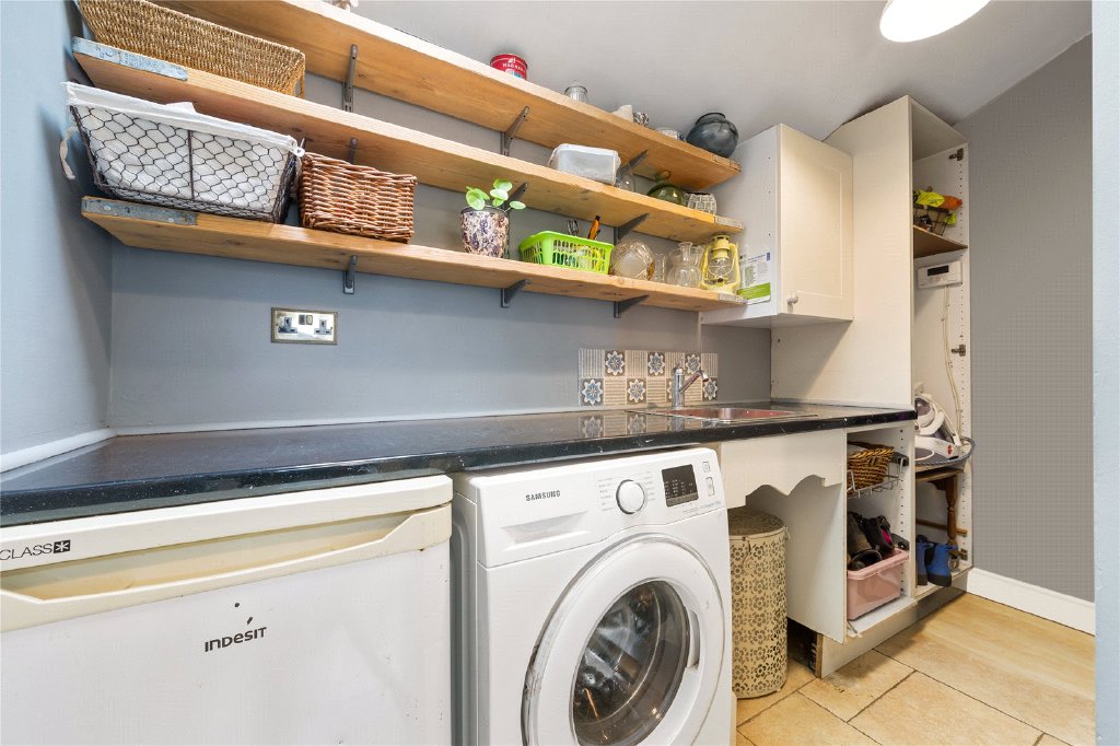The corridor also gives access to a shower and w.c, a further doorway opens into a utility area with washing machine, sink, wall mounted gas boiler, under counter fridge & open shelving.