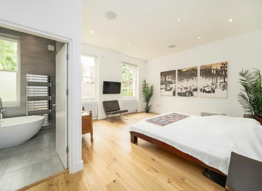 On the first floor, the principal suite provides a serene retreat, complemented by four further generously sized bedrooms and three luxurious bathrooms on the second floor. A private roof terrace crowns the home, offering a tranquil outdoor escape.