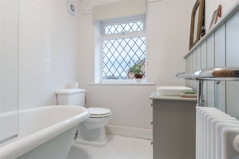 From the hall, stairs lead to a first floor landing with a study area and a loft access. Bedroom 1 has a Victorian fireplace, exposed floorboards and a double wardrobe. Bedroom 2 has exposed timber floorboards, and there is an attractive, part panelled bathroom with contemporary style white suite comprising rolltop bath (with shower and screen over), WC and wash basin.