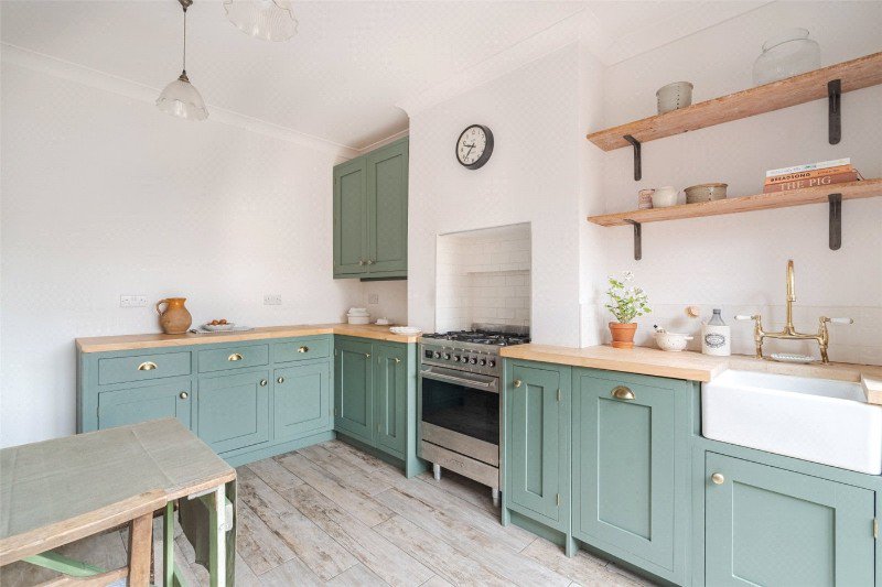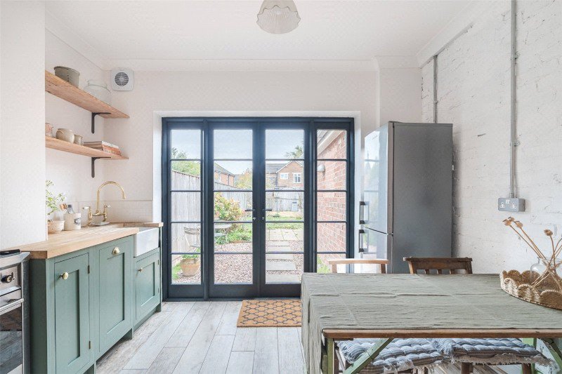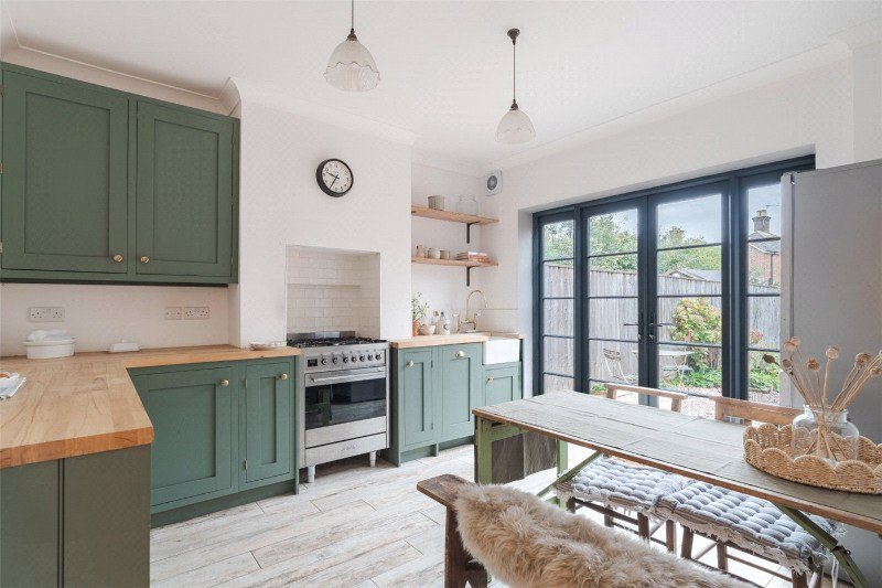 The kitchen/dining room has been re-fitted with modern units, solid beech worktops, Belfast sink, slimline dishwasher, tiled recess with Smeg cooker (with 5-burner hob and electric fan oven), space for upright fridge-freezer, ceramic tiled floor, and black-framed double glazed French doors to the rear garden.