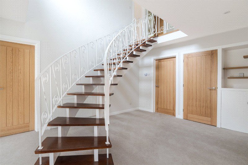 From the reception hall, a distinctive, sweeping staircase (with wrought ironwork) leads to a semi-galleried landing with loft access.